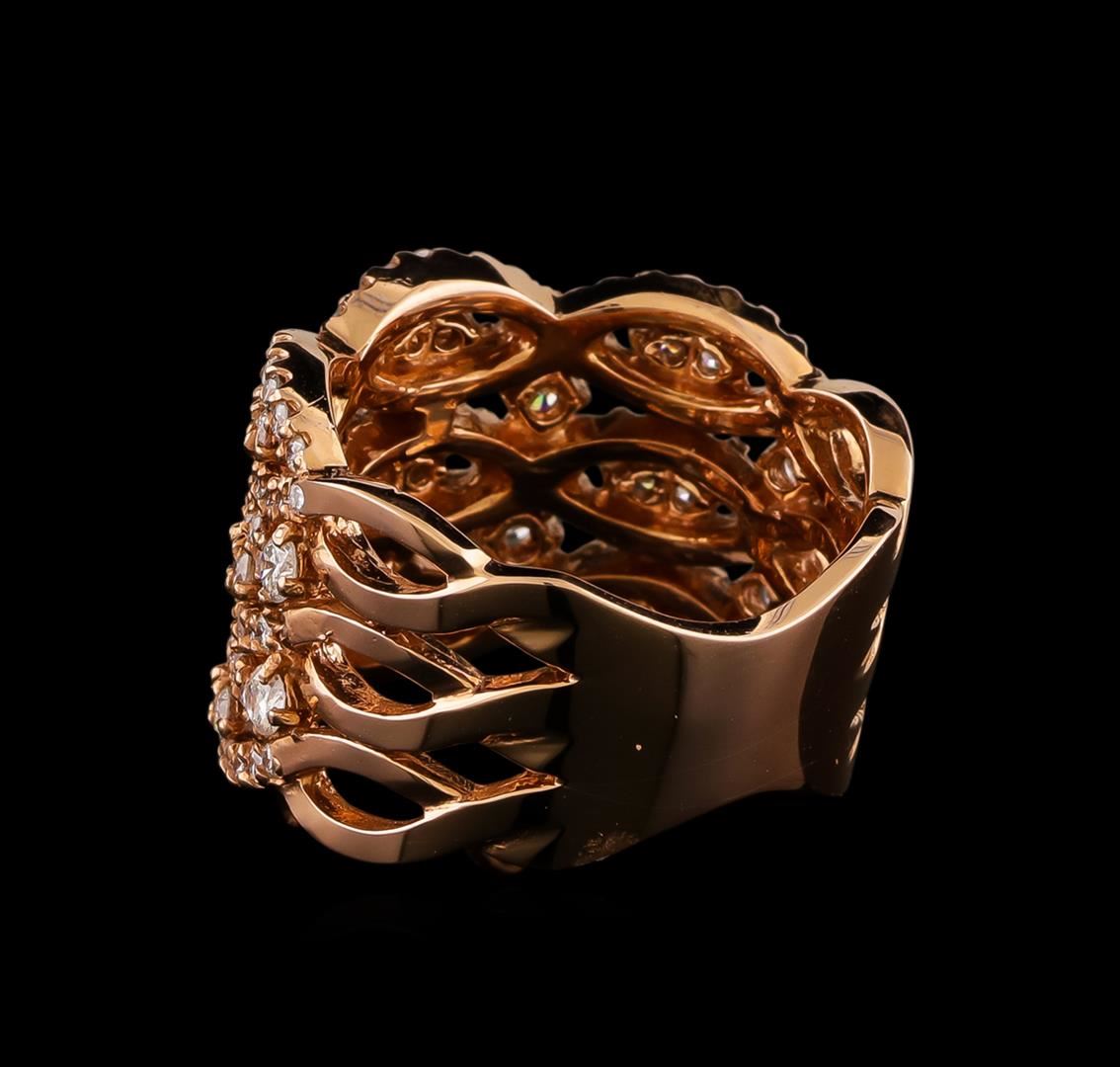 One electronically tested 14KT rose gold ladies combination cast & assembled diamond ring with a bright polish finish. Identified with markings of "K14". Condition is new. Containing: One Hundred Thirty-Eight prong set round brilliant cut diamonds, measuring 1.10 - 1.10 x 0.66mm (depth est.) approximate total weight of 138 Stones = 0.66ct. Clarity: I-1. Color: J, Cut is Good. Twenty-Six prong set round brilliant cut diamonds, measuring 2.00 - 1.60 x 1.08mm (depth est.) approximate total weight of 26 Stones = 0.55ct. Clarity: I-1. Color: I - J, Cut is Good. All diamonds are graded in the mounting, unless otherwise stated. Total Weight of Diamonds 1.22ct. Total Weight of Ring 10.50 grams. GGL Appraised at $5,010.00.