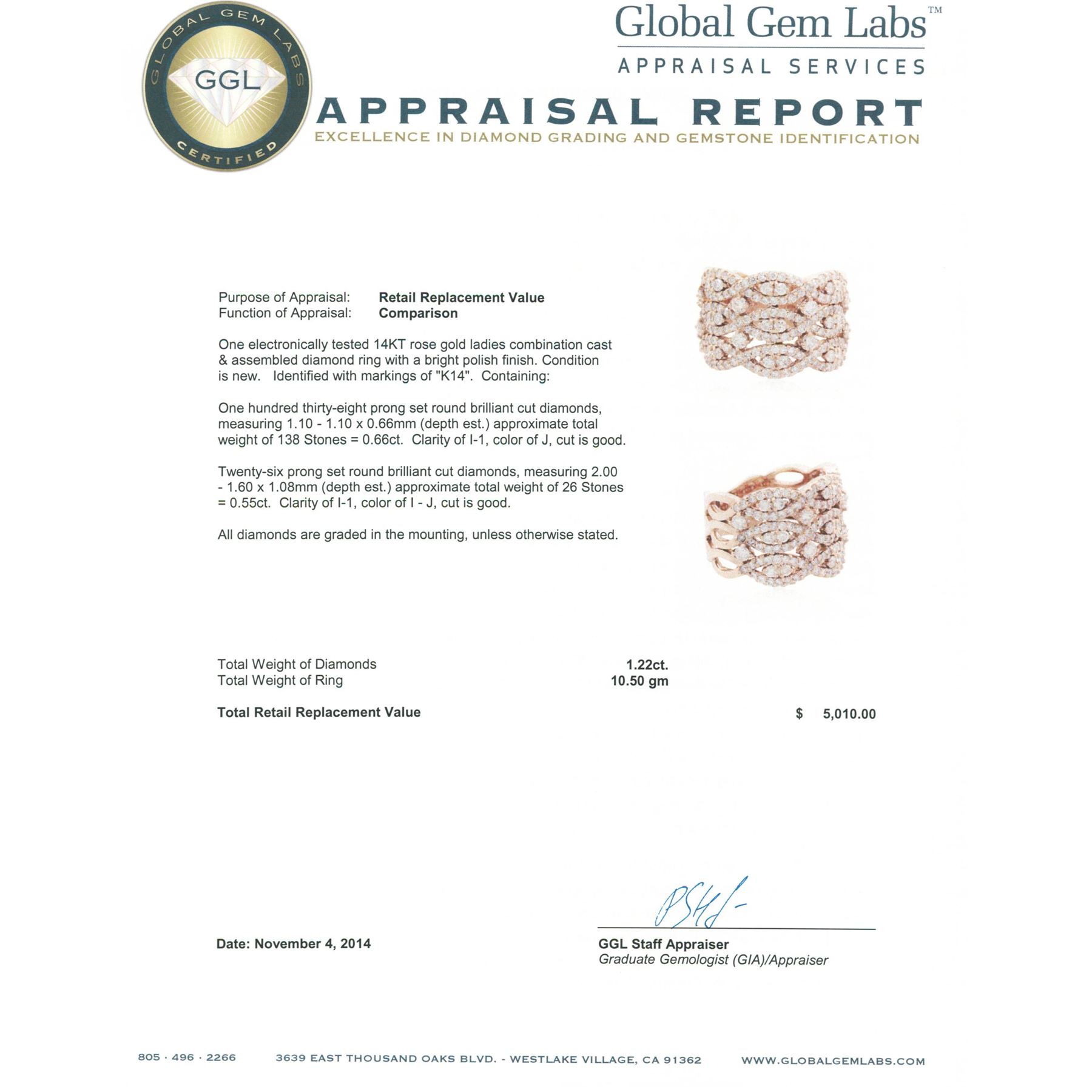 One electronically tested 14KT rose gold ladies combination cast & assembled diamond ring with a bright polish finish. Identified with markings of "K14". Condition is new. Containing: One Hundred Thirty-Eight prong set round brilliant cut diamonds, measuring 1.10 - 1.10 x 0.66mm (depth est.) approximate total weight of 138 Stones = 0.66ct. Clarity: I-1. Color: J, Cut is Good. Twenty-Six prong set round brilliant cut diamonds, measuring 2.00 - 1.60 x 1.08mm (depth est.) approximate total weight of 26 Stones = 0.55ct. Clarity: I-1. Color: I - J, Cut is Good. All diamonds are graded in the mounting, unless otherwise stated. Total Weight of Diamonds 1.22ct. Total Weight of Ring 10.50 grams. GGL Appraised at $5,010.00.