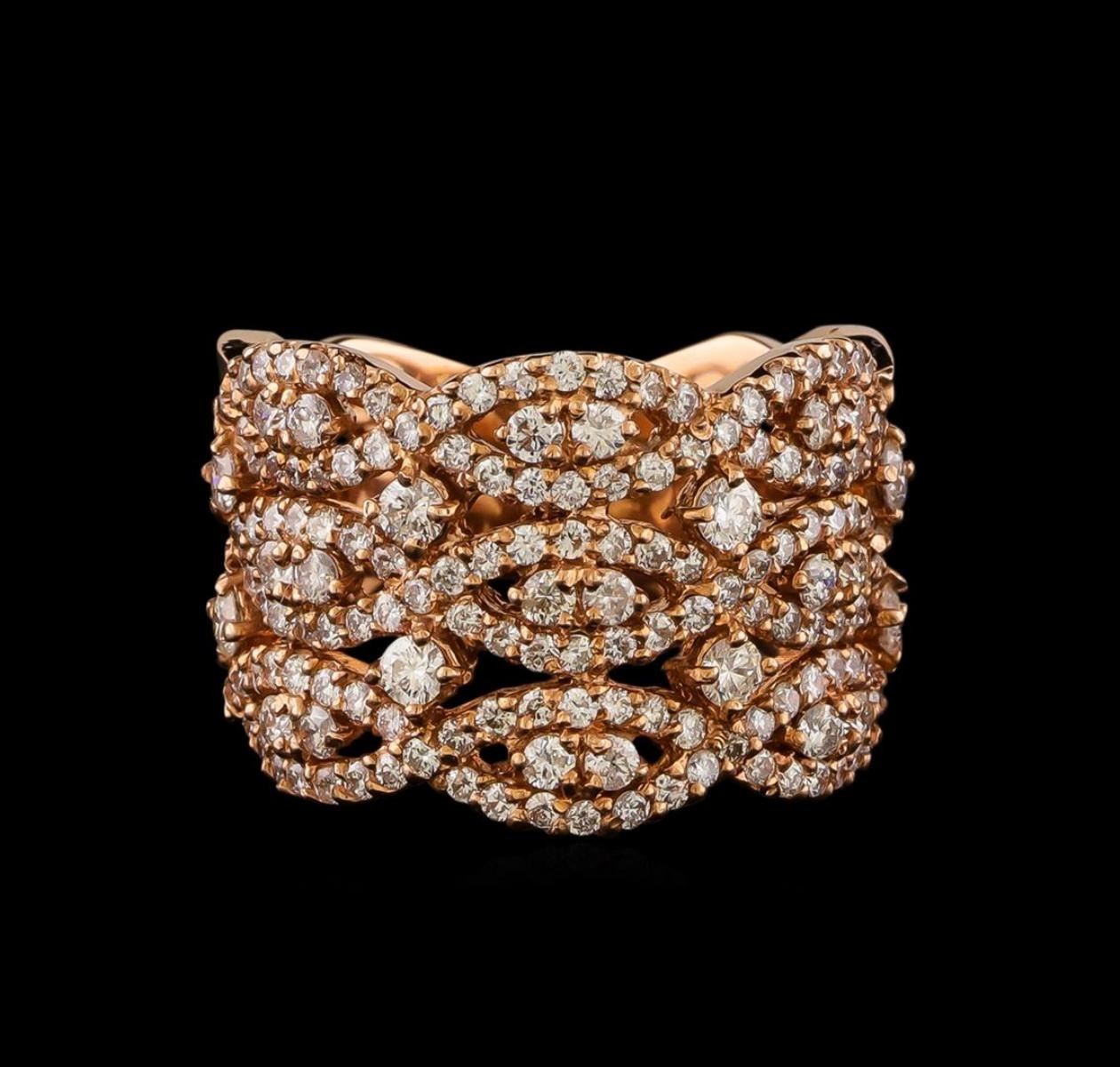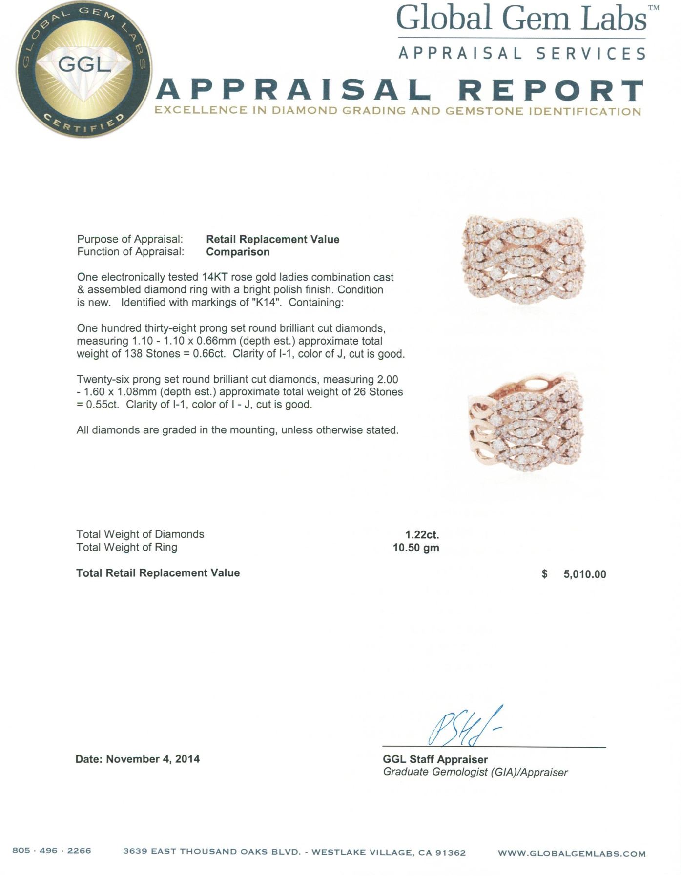 One electronically tested 14KT rose gold ladies combination cast & assembled diamond ring with a bright polish finish. Identified with markings of "K14". Condition is new. Containing: One Hundred Thirty-Eight prong set round brilliant cut diamonds, measuring 1.10 - 1.10 x 0.66mm (depth est.) approximate total weight of 138 Stones = 0.66ct. Clarity: I-1. Color: J, Cut is Good. Twenty-Six prong set round brilliant cut diamonds, measuring 2.00 - 1.60 x 1.08mm (depth est.) approximate total weight of 26 Stones = 0.55ct. Clarity: I-1. Color: I - J, Cut is Good. All diamonds are graded in the mounting, unless otherwise stated. Total Weight of Diamonds 1.22ct. Total Weight of Ring 10.50 grams. GGL Appraised.