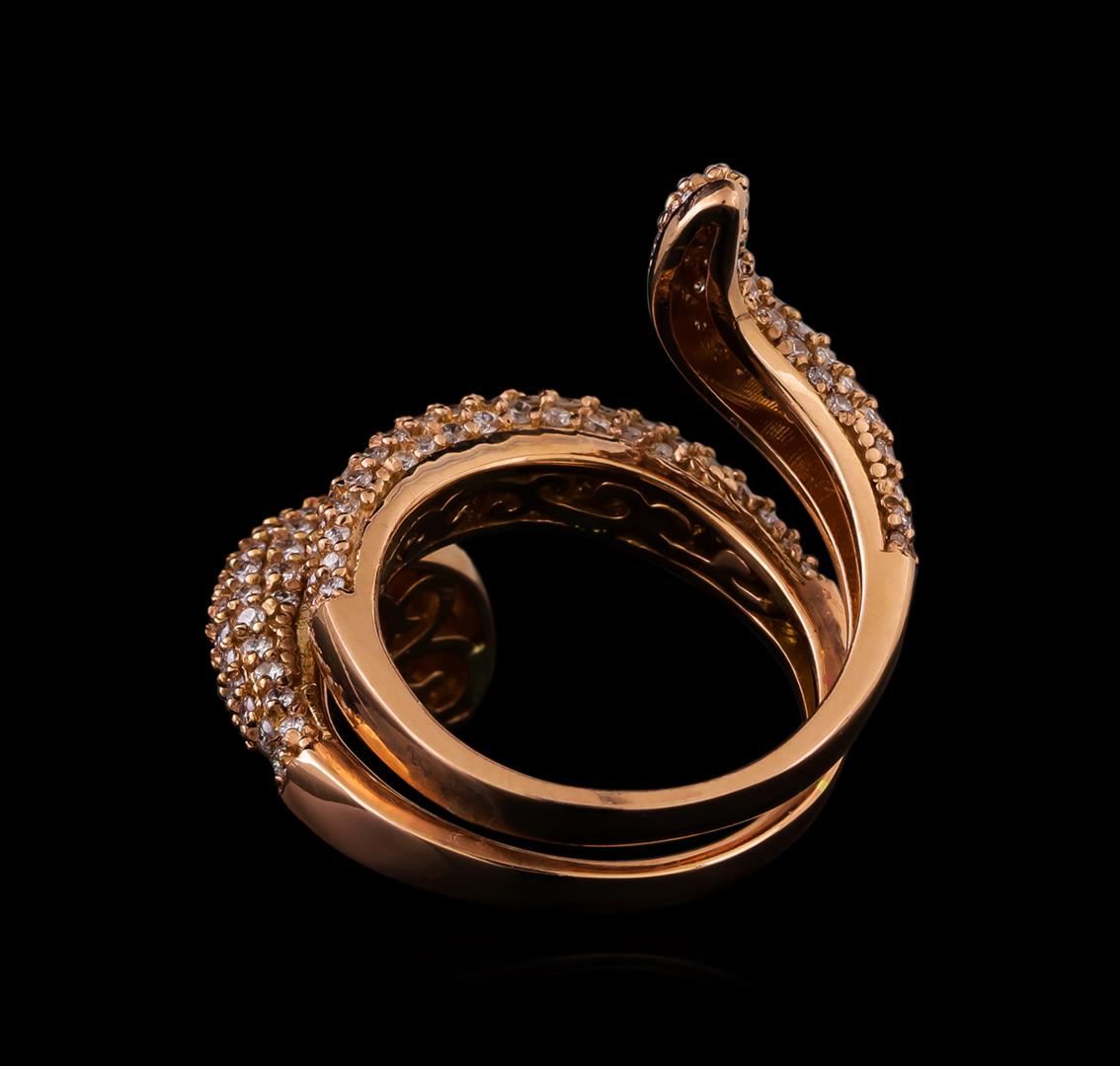 One electronically tested 14KT rose gold ladies cast snake diamond ring with a bright polish finish. Identified with markings of "14K". Condition is new. Containing: Two prong set round brilliant cut diamonds, measuring 1.20 - 1.20 x 0.72mm (depth est.) approximate total weight of 2 Stones = 0.01ct. Cut is Good. One Hundred Twenty-Two prong set round brilliant cut diamonds, measuring 1.50 - 1.30 x 0.84mm (depth est.) approximate total weight of 122 Stones = 1.22ct. Clarity: SI-1 to I-1. Color: I - J, Cut is Good. All diamonds are graded in the mounting, unless otherwise stated. Total Weight of Diamonds 1.23ct. Total Weight of Diamond Ring 11.60 grams. GGL Appraised at $6,425.00.