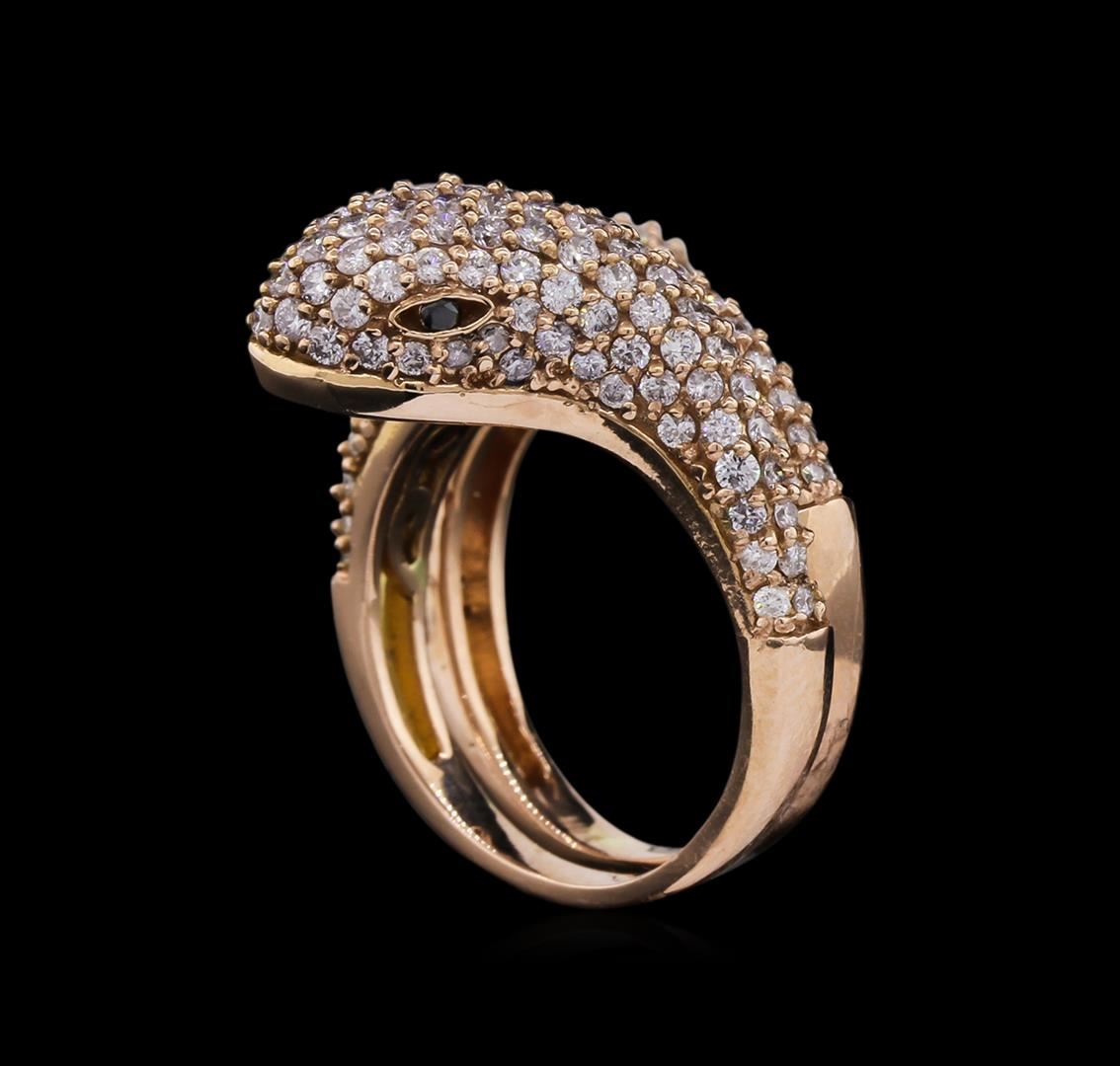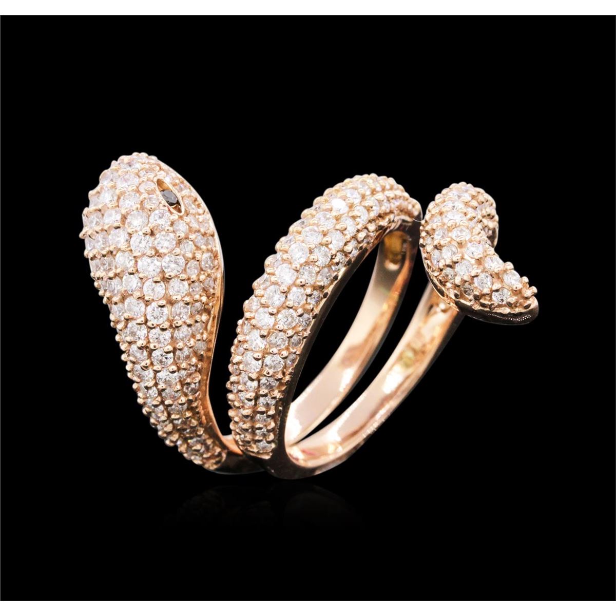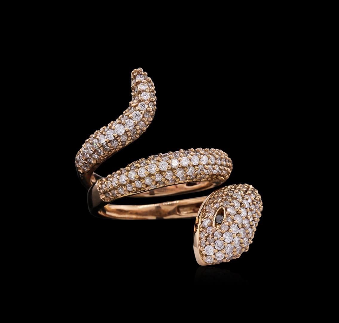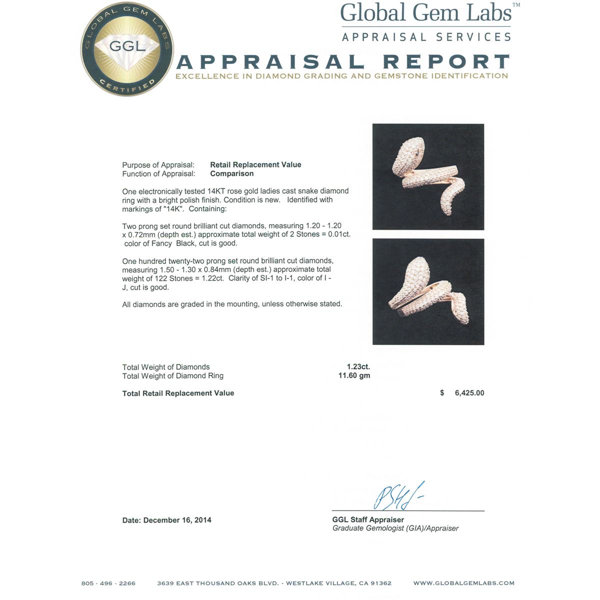 One electronically tested 14KT rose gold ladies cast snake diamond ring with a bright polish finish. Identified with markings of "14K". Condition is new. Containing: Two prong set round brilliant cut diamonds, measuring 1.20 - 1.20 x 0.72mm (depth est.) approximate total weight of 2 Stones = 0.01ct. Cut is Good. One Hundred Twenty-Two prong set round brilliant cut diamonds, measuring 1.50 - 1.30 x 0.84mm (depth est.) approximate total weight of 122 Stones = 1.22ct. Clarity: SI-1 to I-1. Color: I - J, Cut is Good. All diamonds are graded in the mounting, unless otherwise stated. Total Weight of Diamonds 1.23ct. Total Weight of Diamond Ring 11.60 grams. GGL Appraised at $6,425.00.