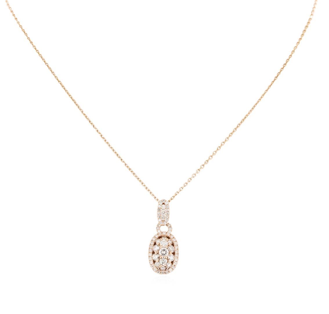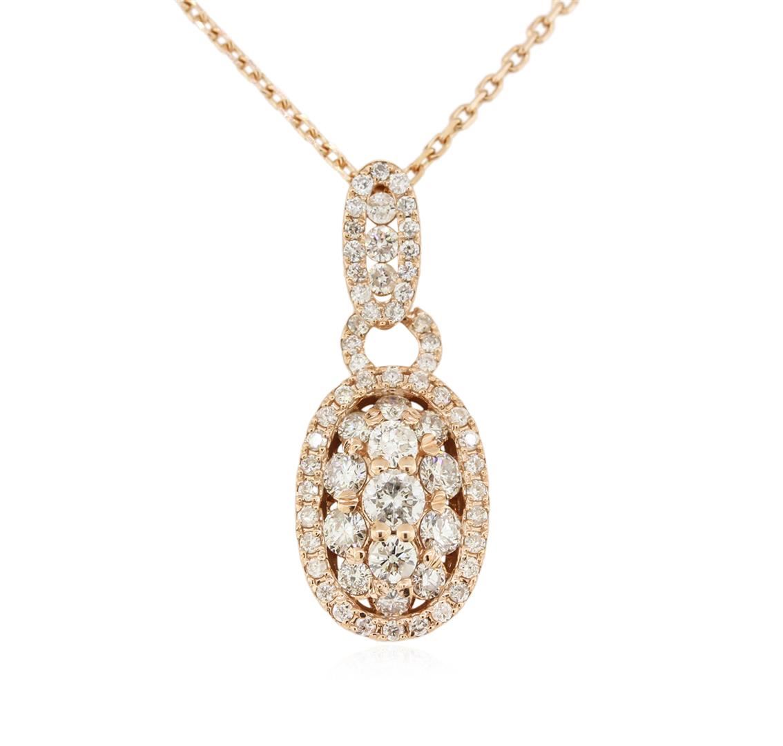 One electronically tested 14KT rose gold lady's combination cast & assembled fashion pendant & chain 16.0" long, 1mm diamond cut cable link with a lobster claw clasp with a bright polish finish. Identified with markings of "K14". Condition is new. Containing: One prong set round brilliant cut diamond, measuring 3.50 - 3.45 x 2.09mm (depth est.) approximate weight of 0.15ct. Graded in the setting. Clarity: I-1. Color: Good Six prong set round brilliant cut diamonds, measuring 2.80 - 2.70 x 1.65mm (depth est.) approximate total weight of 6 Stones = 0.46ct. Graded in the setting. Clarity: SI-2 to I-1. Color: H - I. Cut Good Nine prong set round brilliant cut diamonds, measuring 2.10 - 2.00 x 1.33mm (depth est.) approximate total weight of 9 Stones = 0.31ct. Graded in the setting. Clarity: SI-2 to I-1. Color: H - I. Cut Good Forty-Six prong set round brilliant cut diamonds, measuring 1.30 - 1.20 x 0.75mm (depth est.) approximate total weight of 46 Stones = 0.32ct. Graded in the setting. Clarity: SI-1 to I-1. Color: H - I. Cut Good. Total Weight of Diamonds 1.24ct. Total Weight of Pendant & Chain 4.90gm. GAS Appraised at $3,630.00.