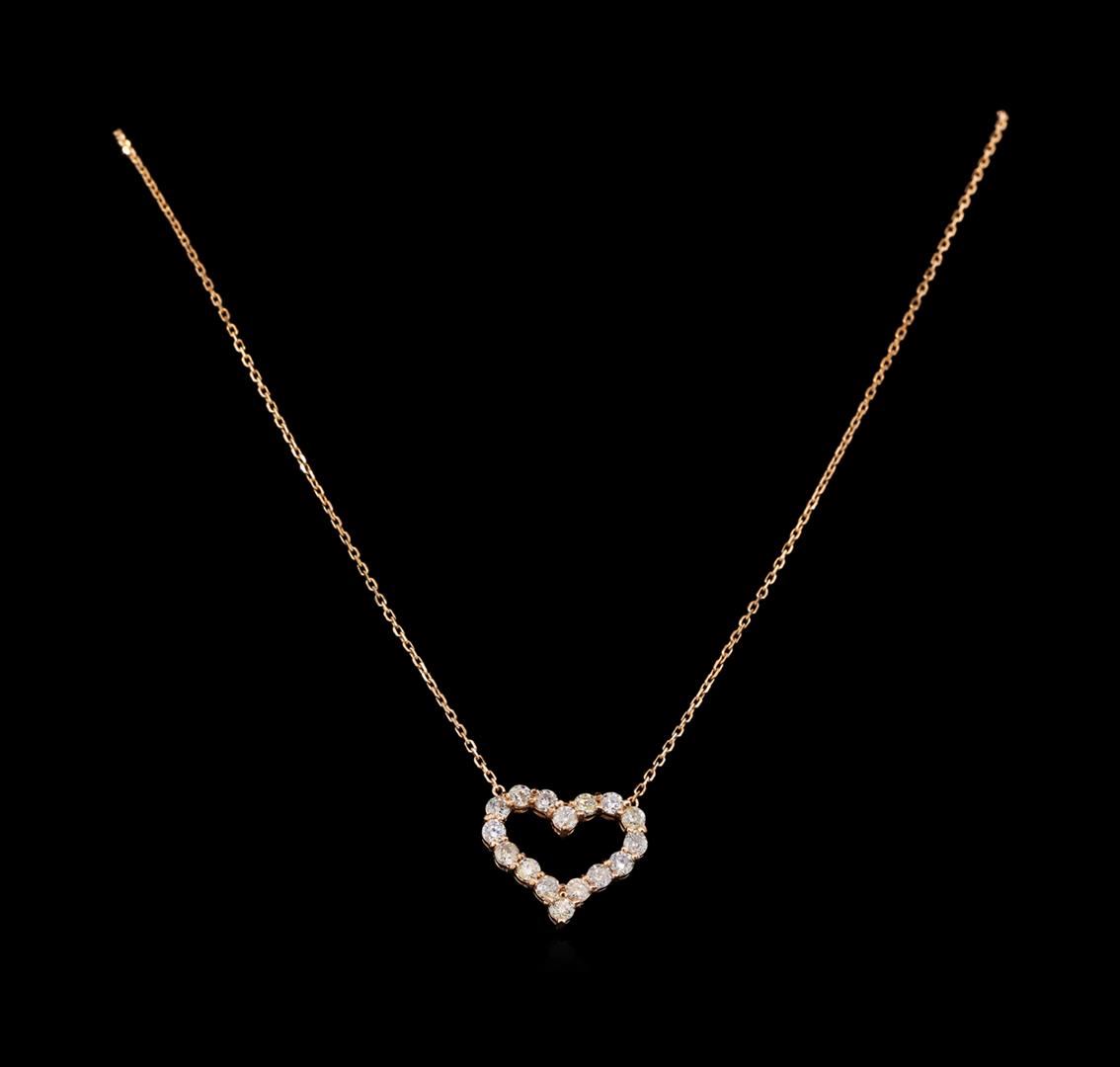 One electronically tested 14KT rose gold ladies cast diamond necklace with a lobster claw clasp with a bright polish finish. Identified with markings of "14K". Condition is new. Containing: Sixteen prong set round brilliant cut diamonds, measuring 2.80 - 2.80 x 1.68mm (depth est.) approximate total weight of 16 Stones = 1.29ct. Clarity: I-1 to I-3. Color: I - K, Cut is Good. All diamonds are graded in the mounting, unless otherwise stated. Total Weight of Diamonds 1.29ct. Total Weight of Necklace 5.30 grams. GGL Appraised at $3,250.00.