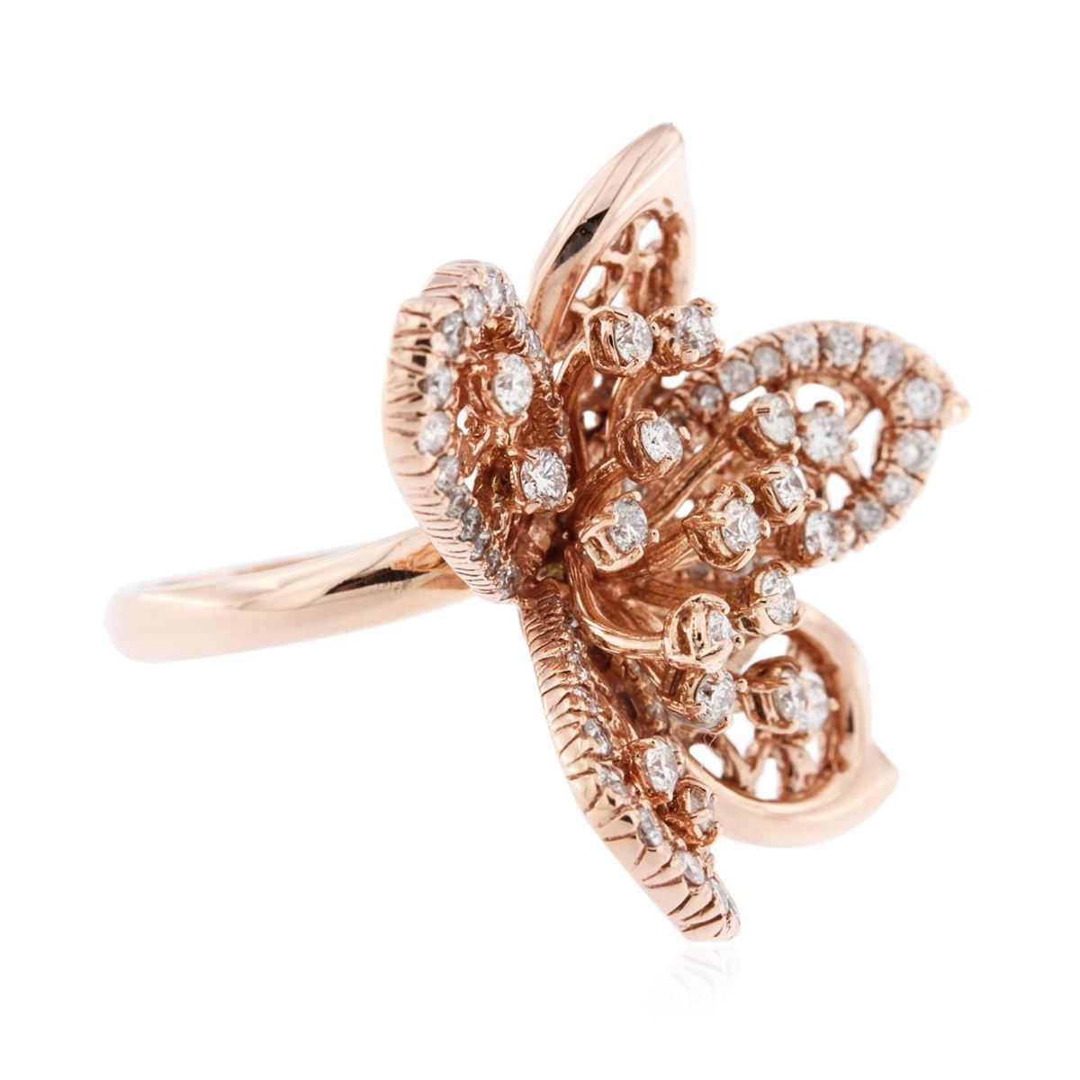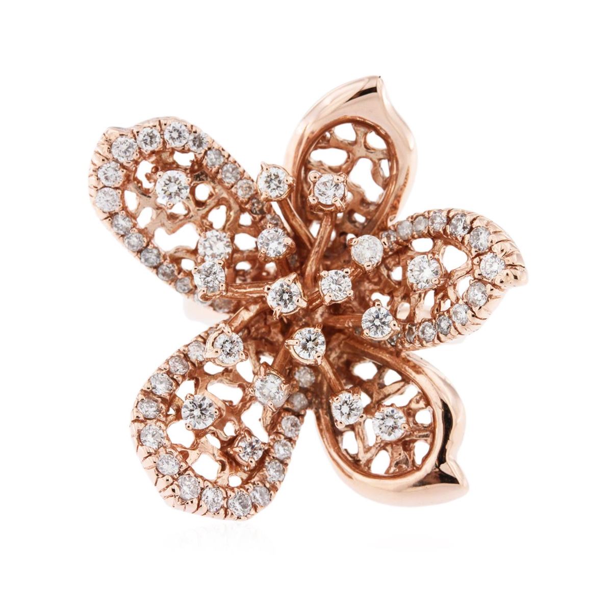 One electronically tested 14KT rose gold ladies cast diamond ring with a bright polish finish. Identified with markings of "14K". Condition is new. Containing: Sixty-Six prong set round brilliant cut diamonds, measuring 2.00 - 1.50 x 1.05mm (depth est.) approximate total weight of 66 Stones = 1.29ct. Clarity: SI-1 to I-1. Color: I - J. All diamonds are graded in the mounting, unless otherwise stated. Total Weight of Diamonds 1.29ct. Total Weight of Ring 12.30 grams. GGL Appraised at $5,160.00.
