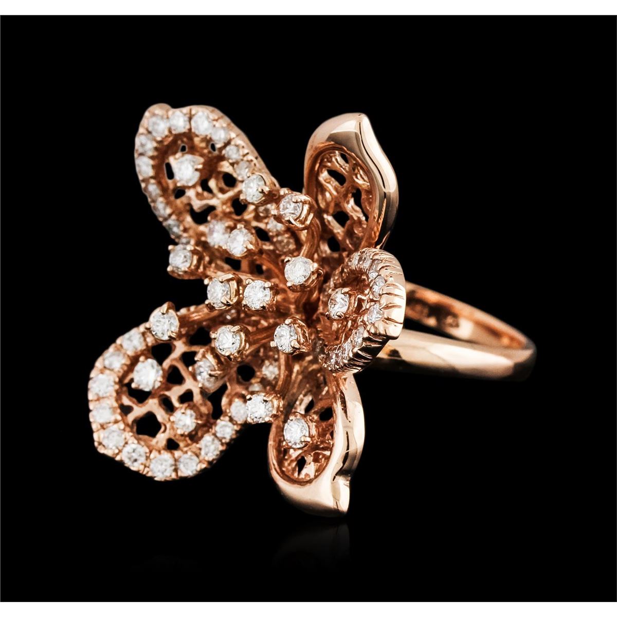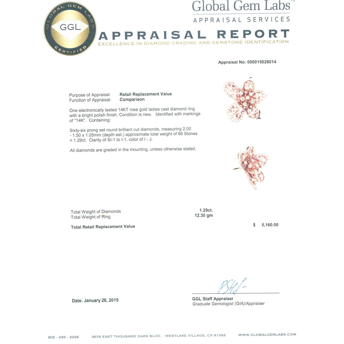 One electronically tested 14KT rose gold ladies cast diamond ring with a bright polish finish. Identified with markings of "14K". Condition is new. Containing: Sixty-Six prong set round brilliant cut diamonds, measuring 2.00 - 1.50 x 1.05mm (depth est.) approximate total weight of 66 Stones = 1.29ct. Clarity: SI-1 to I-1. Color: I - J. All diamonds are graded in the mounting, unless otherwise stated. Total Weight of Diamonds 1.29ct. Total Weight of Ring 12.30 grams. GGL Appraised at $5,160.00.
