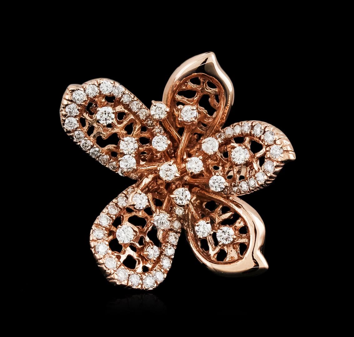 One electronically tested 14KT rose gold ladies cast diamond ring with a bright polish finish. Identified with markings of "14K". Condition is new. Containing: Sixty-Six prong set round brilliant cut diamonds, measuring 2.00 - 1.50 x 1.05mm (depth est.) approximate total weight of 66 Stones = 1.29ct. Clarity: SI-1 to I-1. Color: I - J. All diamonds are graded in the mounting, unless otherwise stated. Total Weight of Diamonds 1.29ct. Total Weight of Ring 12.30 grams. GGL Appraised at $5,160.00.