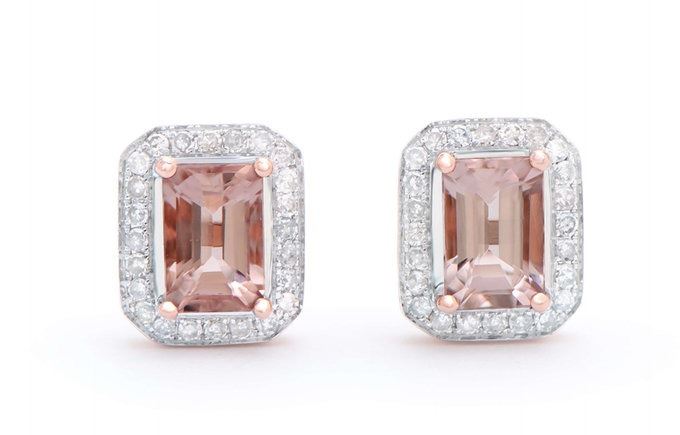 Morganite Color: Peach-Pink Shape: Octagon Size: 6x4 Quantity: 2 CTW: 1.31 Diamond Description Shape: Rounds Size: 0.9 mm Quantity: 48 CTW: 0.22 Grade: I1-I2 Color: H-I. Total Weight: 2.85 grams.