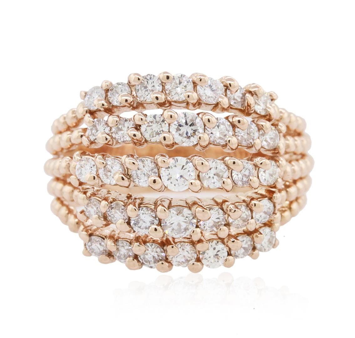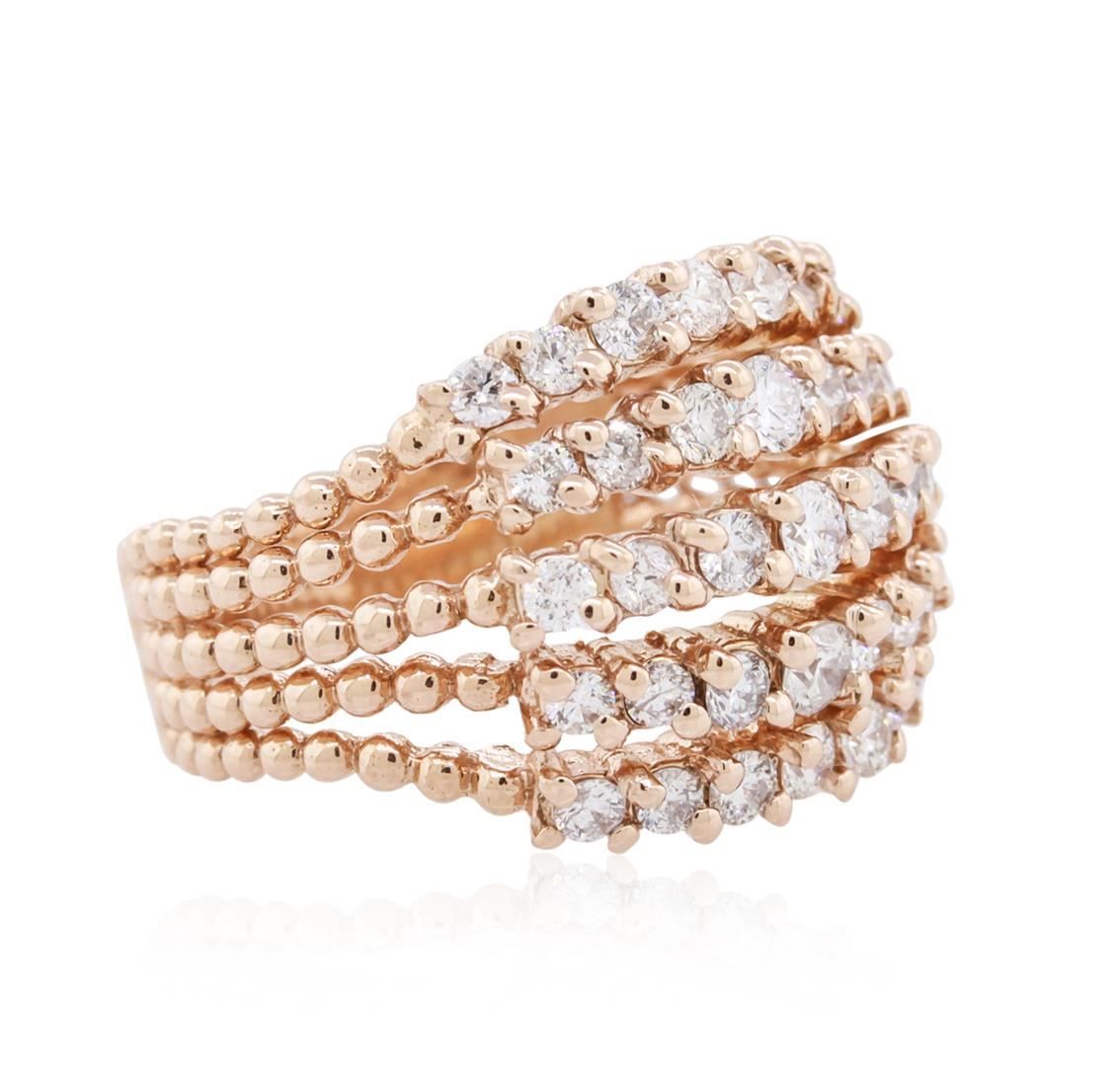 One electronically tested 14KT rose gold ladies combination cast & assembled diamond ring with a split shank with a bright polish finish. Identified with markings of K14. Condition is new. Containing: Thirty-Five prong set round brilliant cut diamonds, measuring 2.40 - 2.00 x 1.32mm (depth est.) approximate total weight of 35 Stones = 1.36ct. Clarity: SI-1 to SI-2. Color: I - J, Cut is Good. All diamonds are graded in the mounting, unless otherwise stated. Total Weight of Diamonds 1.36ct. Total Weight of Ring 8.00 grams. GGL Appraised at $4,440.00.