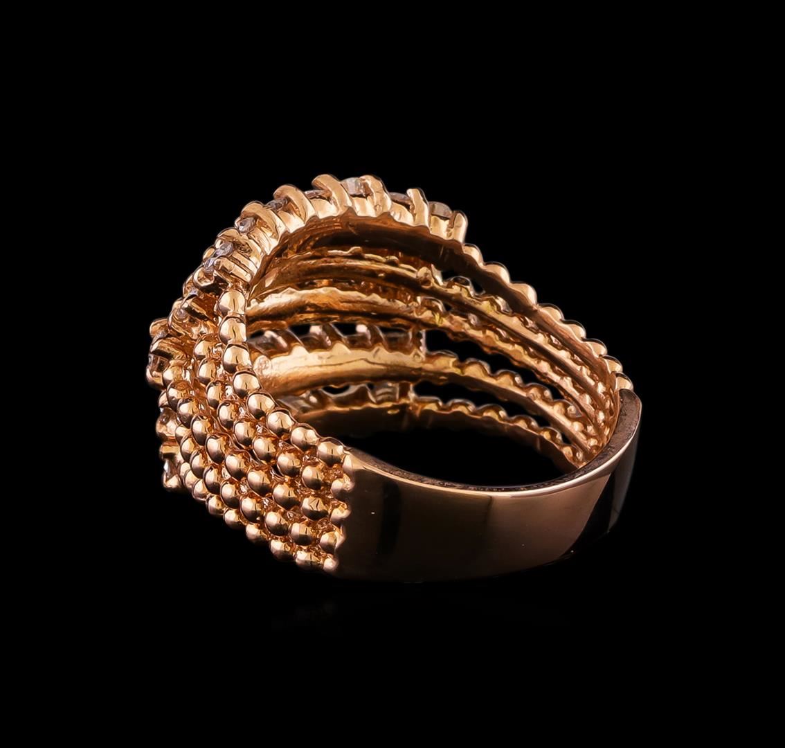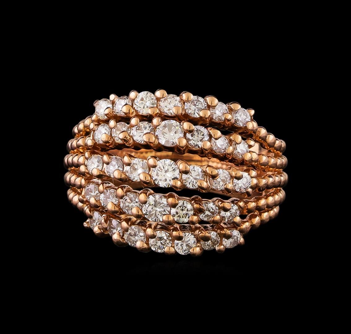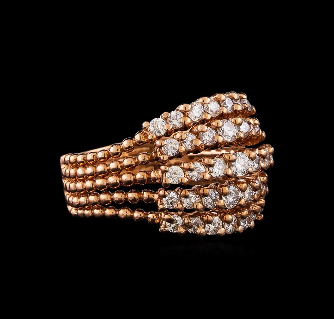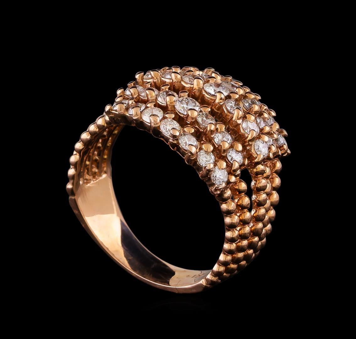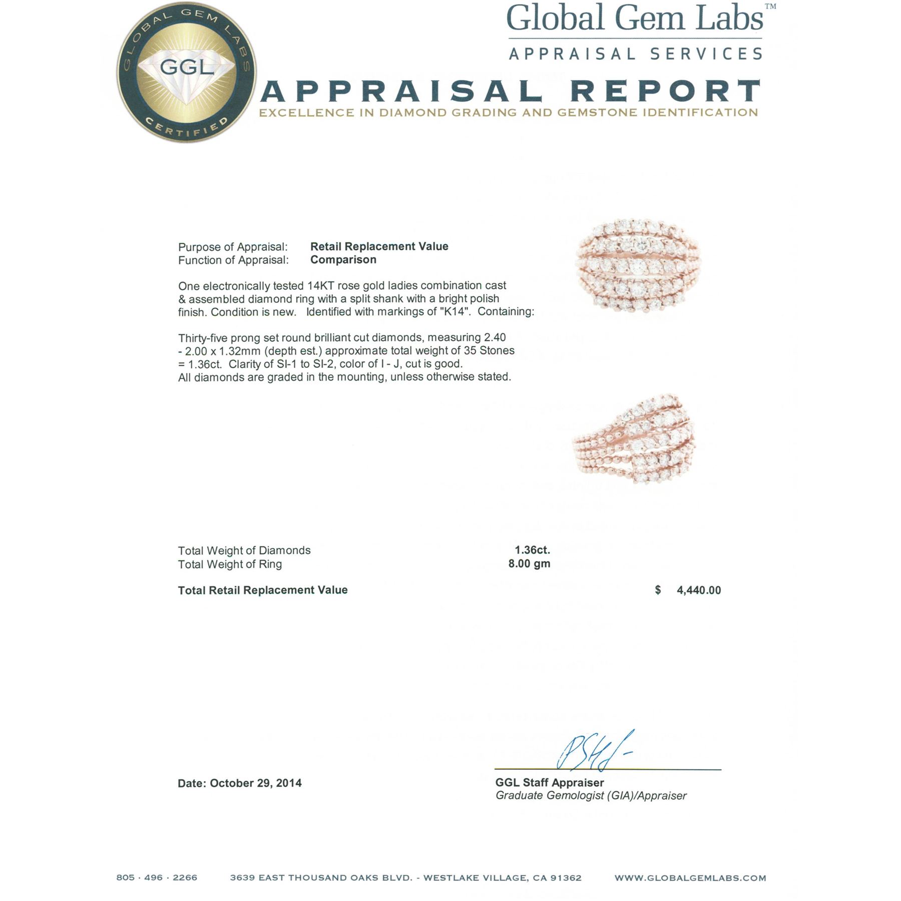 One electronically tested 14KT rose gold ladies combination cast & assembled diamond ring with a split shank with a bright polish finish. Identified with markings of K14. Condition is new. Containing: Thirty-Five prong set round brilliant cut diamonds, measuring 2.40 - 2.00 x 1.32mm (depth est.) approximate total weight of 35 Stones = 1.36ct. Clarity: SI-1 to SI-2. Color: I - J, Cut is Good. All diamonds are graded in the mounting, unless otherwise stated. Total Weight of Diamonds 1.36ct. Total Weight of Ring 8.00 grams. GGL Appraised at $4,440.00.