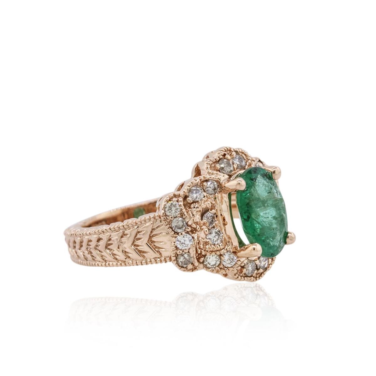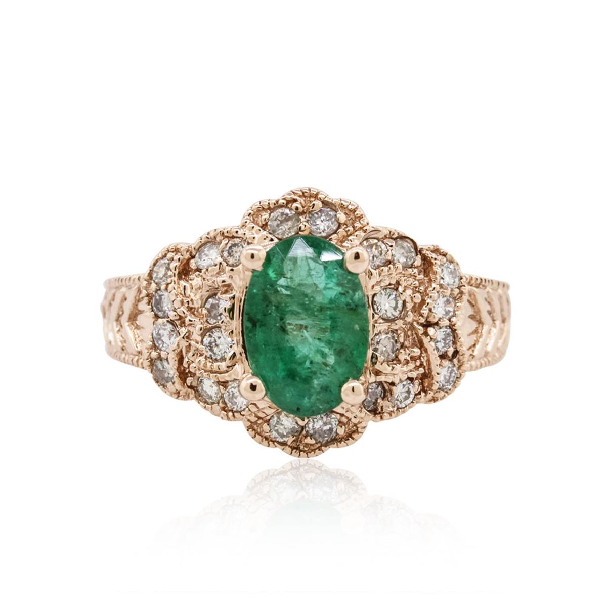 One ring featuring: 14KT rose gold weighing 7.80 grams containing one prong set oval cut emerald with a total weight of 1.36ct and pave set round cut diamonds with a total weight of 0.44cts.