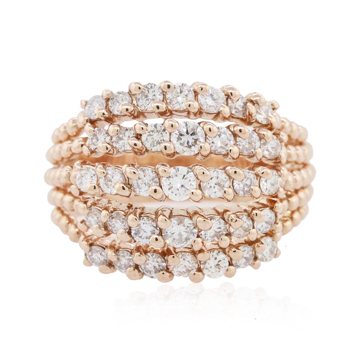 One electronically tested 14KT rose gold ladies combination cast & assembled diamond ring with a split shank with a bright polish finish. Identified with markings of K14. Condition is new. Containing: Thirty-Five prong set round brilliant cut diamonds, measuring 2.40 - 2.00 x 1.32mm (depth est.) approximate total weight of 35 Stones = 1.36ct. Clarity: SI-1 to SI-2. Color: I - J, Cut is Good. All diamonds are graded in the mounting, unless otherwise stated. Total Weight of Diamonds 1.36ct. Total Weight of Ring 8.00 grams. GGL Appraised at $4,440.00.