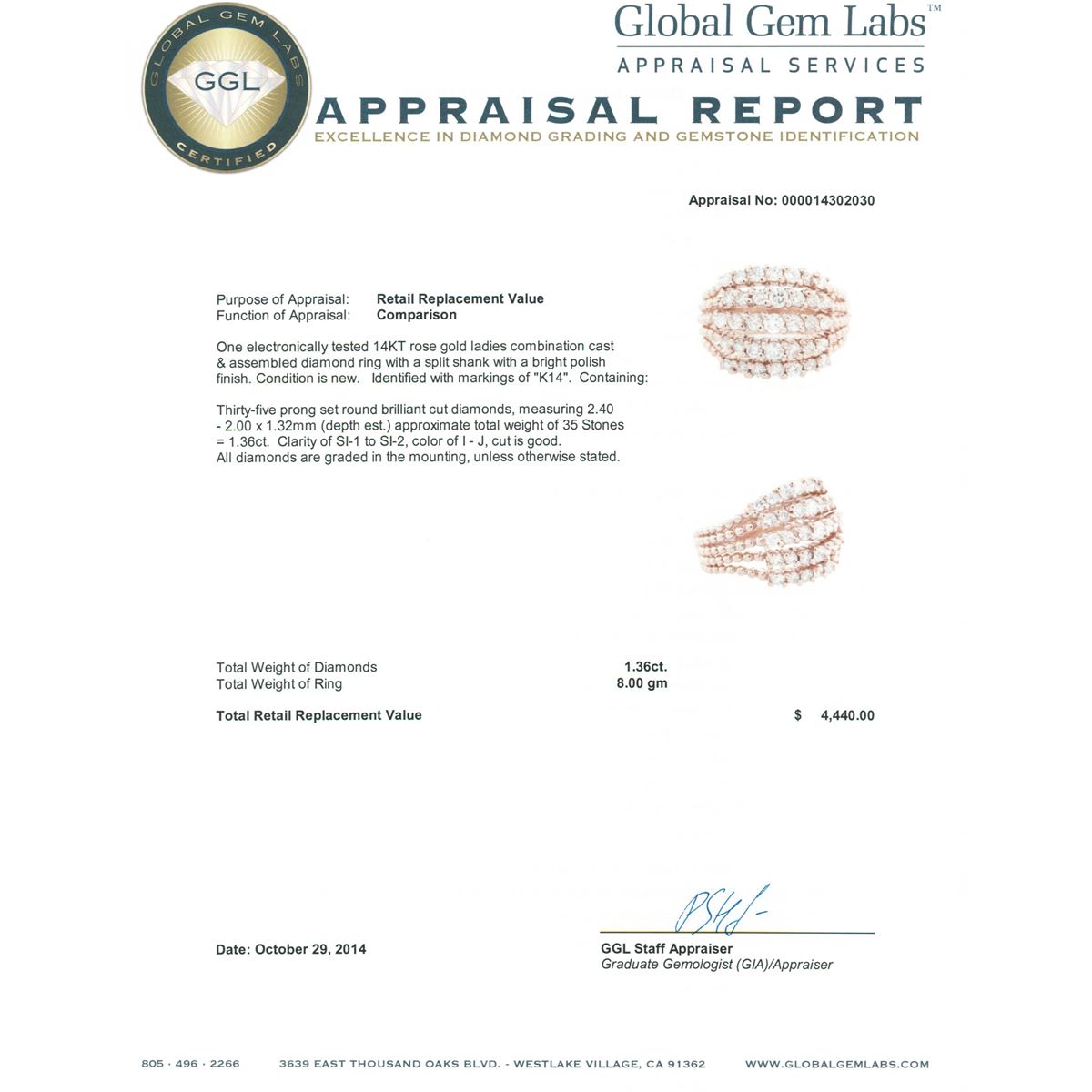 One electronically tested 14KT rose gold ladies combination cast & assembled diamond ring with a split shank with a bright polish finish. Identified with markings of K14. Condition is new. Containing: Thirty-Five prong set round brilliant cut diamonds, measuring 2.40 - 2.00 x 1.32mm (depth est.) approximate total weight of 35 Stones = 1.36ct. Clarity: SI-1 to SI-2. Color: I - J, Cut is Good. All diamonds are graded in the mounting, unless otherwise stated. Total Weight of Diamonds 1.36ct. Total Weight of Ring 8.00 grams. GGL Appraised at $4,440.00.
