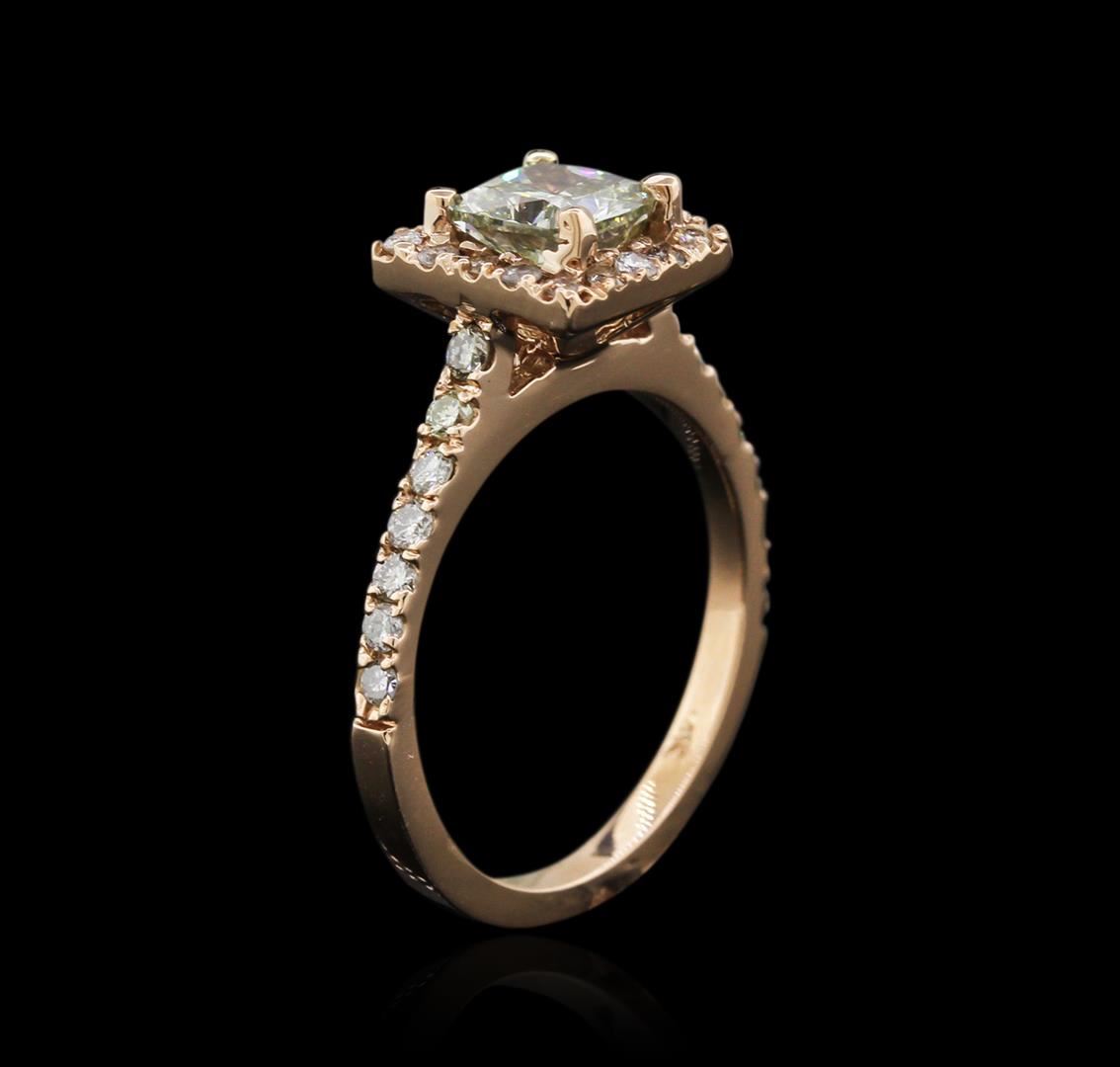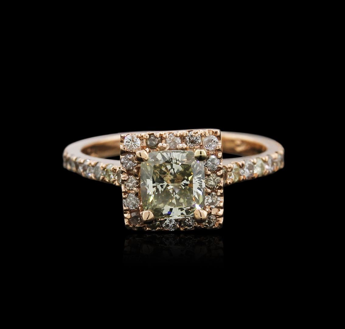 One electronically tested 14KT rose gold ladies cast diamond ring with a bright polish finish. Identified with markings of "14K". Condition is new. Containing: One prong set cushion cut diamond, measuring 5.90 x 5.50 x 3.90mm (depth est.) approximate weight of 1.08ct. Clarity: VS-2, color of Fancy Light Green, Cut is Good. Whether the color of this diamond is of natural origin or an artificial process cannot currently be determined. Thirty prong set round brilliant cut diamonds, measuring 1.50 - 1.30 x 0.84mm (depth est.) approximate total weight of 30 Stones = 0.30ct. Clarity: I-1 to I-2. Color: J - K. All diamonds are graded in the mounting, unless otherwise stated. Total Weight of Diamonds 1.38ct. Total Weight of Ring 3.70 grams. GGL Appraised at $5,020.00.