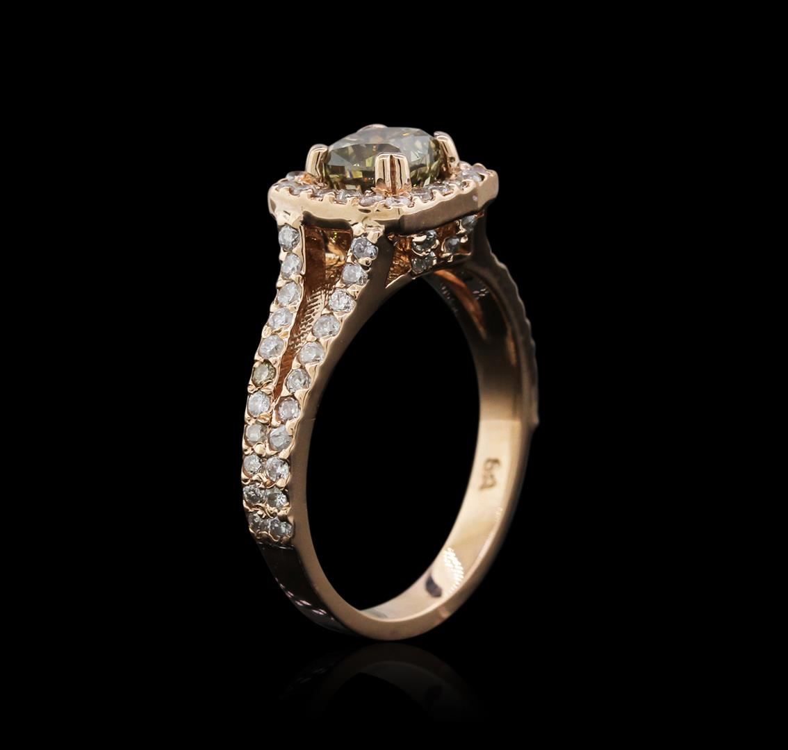 One electronically tested 14KT rose gold ladies cast diamond ring with a bright polish finish. Identified with markings of "14K". Condition is new. Containing: One prong set cushion cut diamond, measuring 5.50 x 5.50 x 3.41mm (depth est.) approximate weight of 0.88ct. Clarity: I-1, color of Fancy Yellowish Green, Cut is Good. Whether the color of this diamond is of natural origin or an artificial process cannot currently be determined. Sixty-Four prong set round brilliant cut diamonds, measuring 1.30 - 1.30 x 0.78mm (depth est.) approximate total weight of 64 Stones = 0.51ct. Clarity: SI-2 to I-2. Color: J - K. All diamonds are graded in the mounting, unless otherwise stated. Total Weight of Diamonds 1.39ct. Total Weight of Ring 4.70 grams. GGL Appraised at $5,595.00.