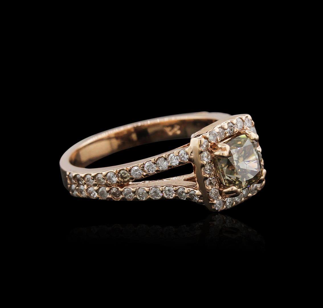 One electronically tested 14KT rose gold ladies cast diamond ring with a bright polish finish. Identified with markings of "14K". Condition is new. Containing: One prong set cushion cut diamond, measuring 5.50 x 5.50 x 3.41mm (depth est.) approximate weight of 0.88ct. Clarity: I-1, color of Fancy Yellowish Green, Cut is Good. Whether the color of this diamond is of natural origin or an artificial process cannot currently be determined. Sixty-Four prong set round brilliant cut diamonds, measuring 1.30 - 1.30 x 0.78mm (depth est.) approximate total weight of 64 Stones = 0.51ct. Clarity: SI-2 to I-2. Color: J - K. All diamonds are graded in the mounting, unless otherwise stated. Total Weight of Diamonds 1.39ct. Total Weight of Ring 4.70 grams. GGL Appraised at $5,595.00.