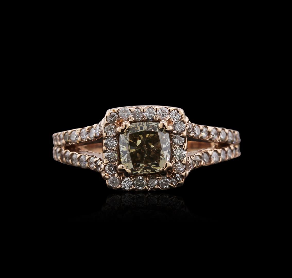 One electronically tested 14KT rose gold ladies cast diamond ring with a bright polish finish. Identified with markings of "14K". Condition is new. Containing: One prong set cushion cut diamond, measuring 5.50 x 5.50 x 3.41mm (depth est.) approximate weight of 0.88ct. Clarity: I-1, color of Fancy Yellowish Green, Cut is Good. Whether the color of this diamond is of natural origin or an artificial process cannot currently be determined. Sixty-Four prong set round brilliant cut diamonds, measuring 1.30 - 1.30 x 0.78mm (depth est.) approximate total weight of 64 Stones = 0.51ct. Clarity: SI-2 to I-2. Color: J - K. All diamonds are graded in the mounting, unless otherwise stated. Total Weight of Diamonds 1.39ct. Total Weight of Ring 4.70 grams. GGL Appraised at $5,595.00.