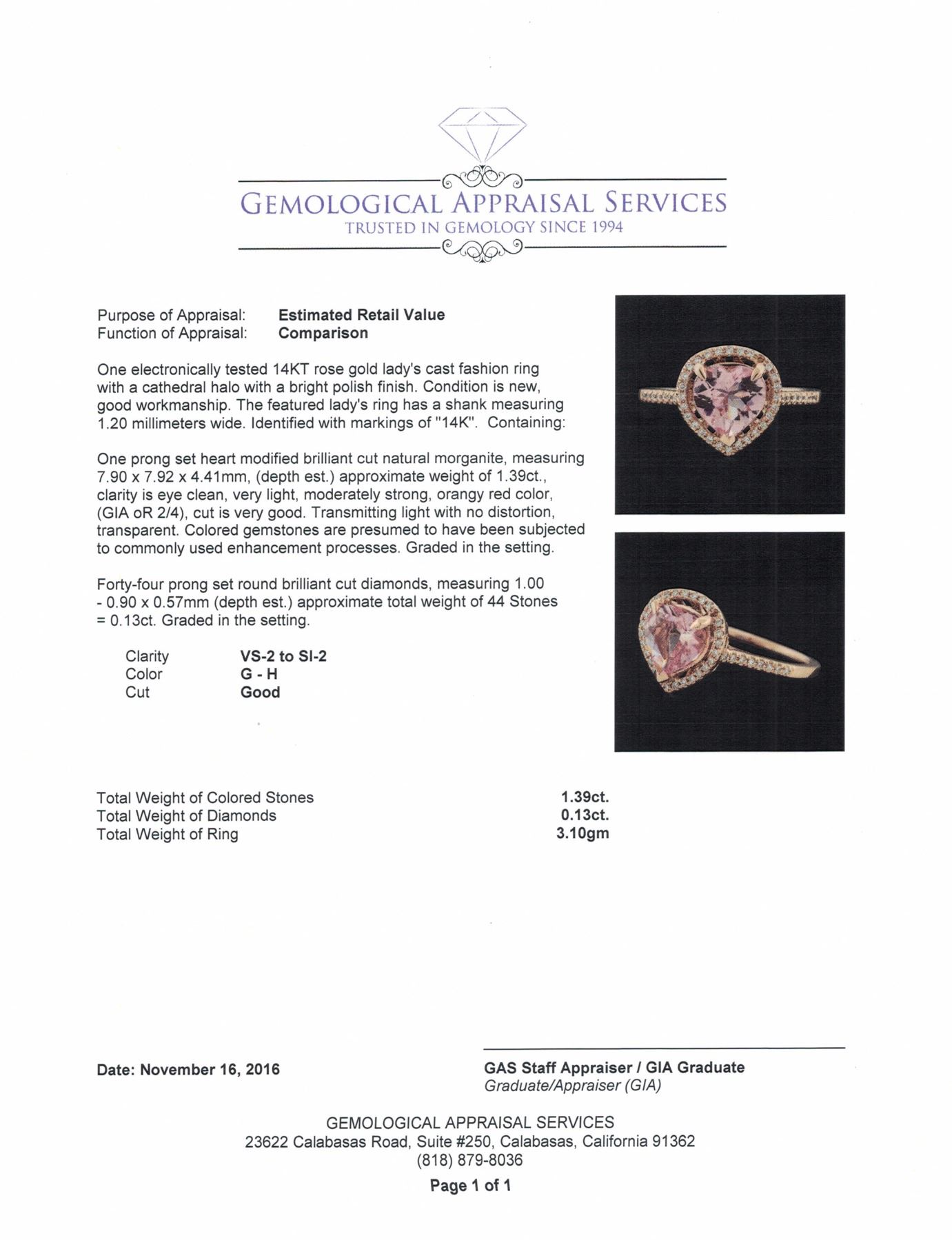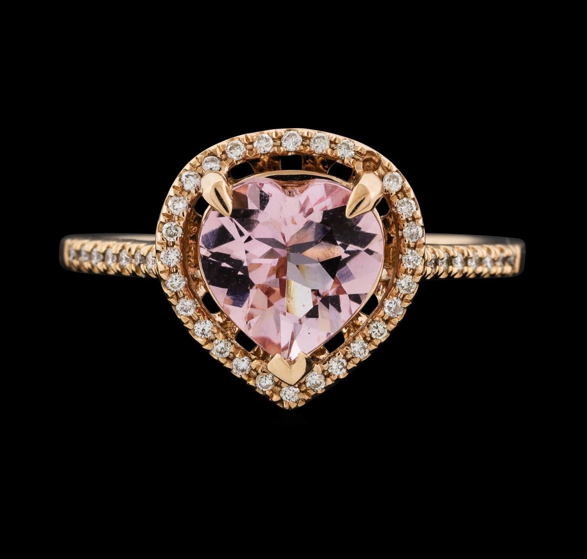One electronically tested 14KT rose gold lady's cast fashion ring with a cathedral halo with a bright polish finish. The featured lady's ring has a shank measuring 1.20 millimeters wide. Identified with markings of "14K". Condition is new, good workmanship. Containing: One prong set heart modified brilliant cut natural morganite, measuring 7.90 x 7.92 x 4.41mm, (depth est.) approximate weight of 1.39ct., clarity is eye clean, very light, moderately strong, orangy red color, (GIA oR 2/4), cut is very good. Transmitting light with no distortion, transparent. Colored gemstones are presumed to have been subjected to commonly used enhancement processes. Graded in the setting. Forty-Four prong set round brilliant cut diamonds, measuring 1.00 - 0.90 x 0.57mm (depth est.) approximate total weight of 44 Stones = 0.13ct. Graded in the setting. Clarity: VS-2 to SI-2. Color: G - HCut Good. Total Weight of Colored Stones 1.39ct. Total Weight of Diamonds 0.13ct. Total Weight of Ring 3.10gm.