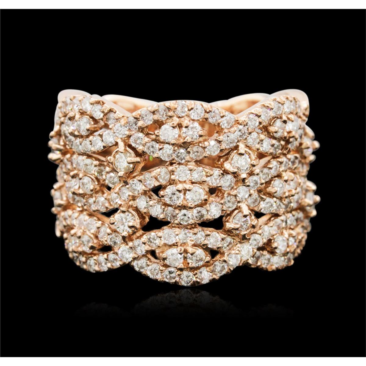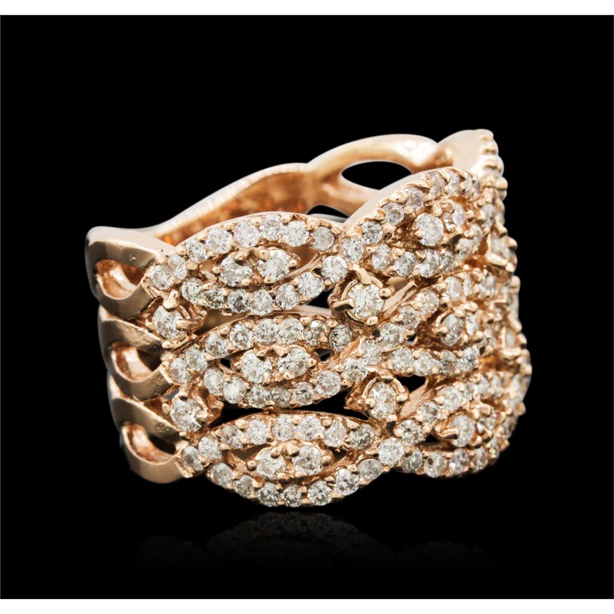 One electronically tested 14KT rose gold ladies cast diamond ring with a bright polish finish. Identified with markings of "K14". Condition is new. Containing: Twenty-Six prong set round brilliant cut diamonds, measuring 1.50 - 1.50 x 0.90mm (depth est.) approximate total weight of 26 Stones = 0.32ct. Clarity: I-1 to I-2. Color: H - I, Cut is Good. One Hundred Thirty-Five prong set round brilliant cut diamonds, measuring 1.30 - 1.30 x 0.78mm (depth est.) approximate total weight of 135 Stones = 1.08ct. Clarity: I-1 to I-2. Color: H - I, Cut is Good. All diamonds are graded in the mounting, unless otherwise stated. Total Weight of Diamonds 1.40ct. Total Weight of Ring 10.30 grams. GGL Appraised at $4,755.00.