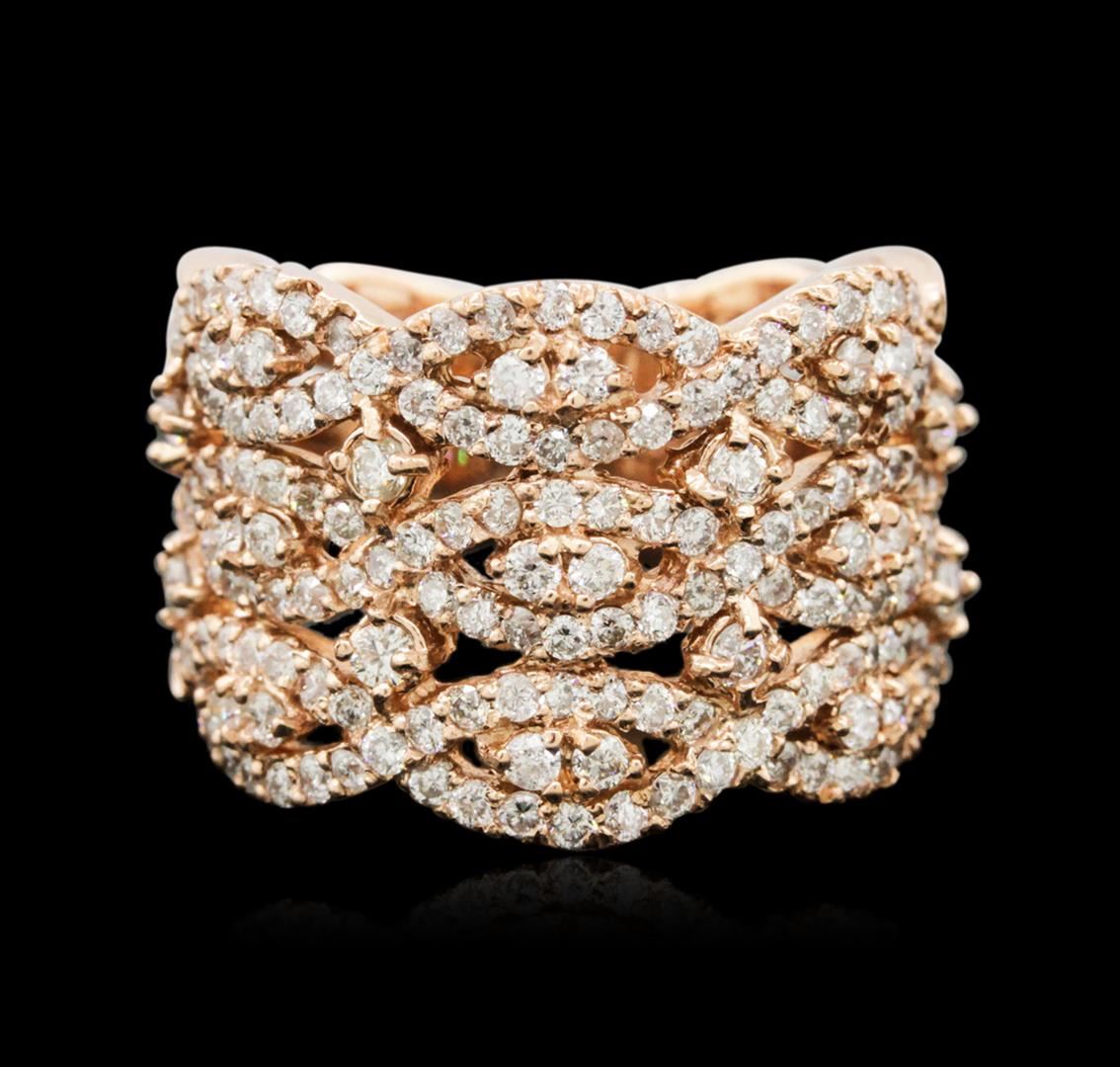 One electronically tested 14KT rose gold ladies cast diamond ring with a bright polish finish. Identified with markings of "K14". Condition is new. Containing: Twenty-Six prong set round brilliant cut diamonds, measuring 1.50 - 1.50 x 0.90mm (depth est.) approximate total weight of 26 Stones = 0.32ct. Clarity: I-1 to I-2. Color: H - I, Cut is Good. One Hundred Thirty-Five prong set round brilliant cut diamonds, measuring 1.30 - 1.30 x 0.78mm (depth est.) approximate total weight of 135 Stones = 1.08ct. Clarity: I-1 to I-2. Color: H - I, Cut is Good. All diamonds are graded in the mounting, unless otherwise stated. Total Weight of Diamonds 1.40ct. Total Weight of Ring 10.30 grams. GGL Appraised at $4,755.00.