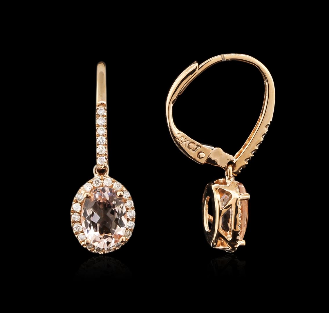 One pair of earrings featuring: 14KT rose gold weighing 1.77 grams containing two morganites with a total weight of 1.41ct and 48 round diamonds with a total weight of 0.19ct.