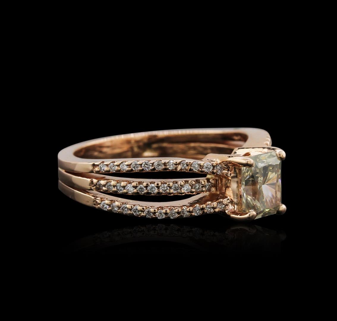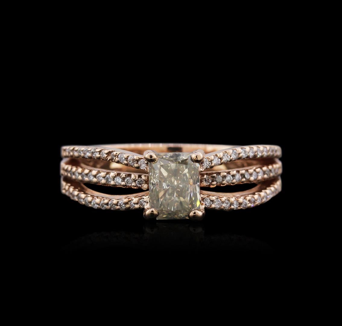 One electronically tested 14KT rose gold ladies cast diamond ring with a bright polish finish. Identified with markings of "14K". Condition is new. Containing: One prong set radiant shaped cut diamond, measuring 6.50 x 5.00 x 3.76mm (depth est.) approximate weight of 1.00ct. Clarity: SI-1, color of Fancy Light Green, Cut is Good. Whether the color of this diamond is of natural origin or an artificial process cannot currently be determined. Sixty-Six prong set round brilliant cut diamonds, measuring 1.20 - 1.20 x 0.72mm (depth est.) approximate total weight of 66 Stones = 0.42ct. Clarity: I-1 to I-2. Color: J - K, Cut is Good. All diamonds are graded in the mounting, unless otherwise stated. One cut approximate weight of 0.00ct.Total Weight of Diamonds 1.42ct. Total Weight of Ring 5.40 grams. GGL Appraised at $4,735.00.