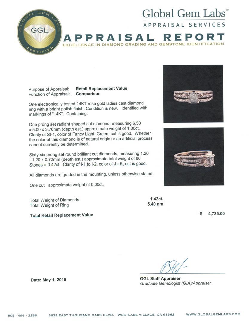 One electronically tested 14KT rose gold ladies cast diamond ring with a bright polish finish. Identified with markings of "14K". Condition is new. Containing: One prong set radiant shaped cut diamond, measuring 6.50 x 5.00 x 3.76mm (depth est.) approximate weight of 1.00ct. Clarity: SI-1, color of Fancy Light Green, Cut is Good. Whether the color of this diamond is of natural origin or an artificial process cannot currently be determined. Sixty-Six prong set round brilliant cut diamonds, measuring 1.20 - 1.20 x 0.72mm (depth est.) approximate total weight of 66 Stones = 0.42ct. Clarity: I-1 to I-2. Color: J - K, Cut is Good. All diamonds are graded in the mounting, unless otherwise stated. One cut approximate weight of 0.00ct.Total Weight of Diamonds 1.42ct. Total Weight of Ring 5.40 grams. GGL Appraised at $4,735.00.