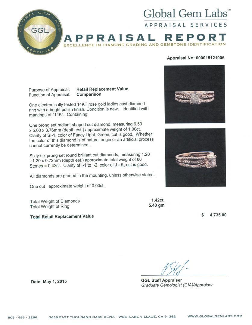 One electronically tested 14KT rose gold ladies cast diamond ring with a bright polish finish. Identified with markings of "14K". Condition is new. Containing: One prong set radiant shaped cut diamond, measuring 6.50 x 5.00 x 3.76mm (depth est.) approximate weight of 1.00ct. Clarity: SI-1, color of Fancy Light Green, Cut is Good. Whether the color of this diamond is of natural origin or an artificial process cannot currently be determined. Sixty-Six prong set round brilliant cut diamonds, measuring 1.20 - 1.20 x 0.72mm (depth est.) approximate total weight of 66 Stones = 0.42ct. Clarity: I-1 to I-2. Color: J - K, Cut is Good. All diamonds are graded in the mounting, unless otherwise stated. One cut approximate weight of 0.00ct.Total Weight of Diamonds 1.42ct. Total Weight of Ring 5.40 grams. GGL Appraised at $4,735.00.
