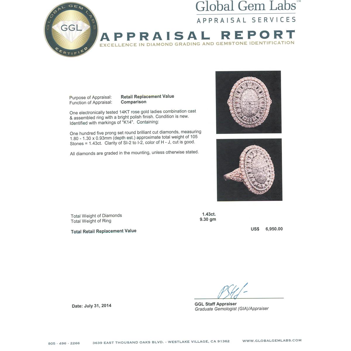 One electronically tested 14KT rose gold ladies combination cast & assembled ring with a bright polish finish. Condition is new. Identified with markings of "K14". Containing: One Hundred Five prong set round brilliant cut diamonds, measuring 1.80 - 1.30 x 0.93mm (depth est.) approximate. Total Weight of 105 Stones = 1.43ct. Clarity: SI-2 to I-2. Color: H - J, Cut is Good. All diamonds are graded in the mounting, unless otherwise stated. Total Weight of Diamonds 1.43ct. Total Weight of Ring 9.30 grams. GGL Appraised at $6,950.00.