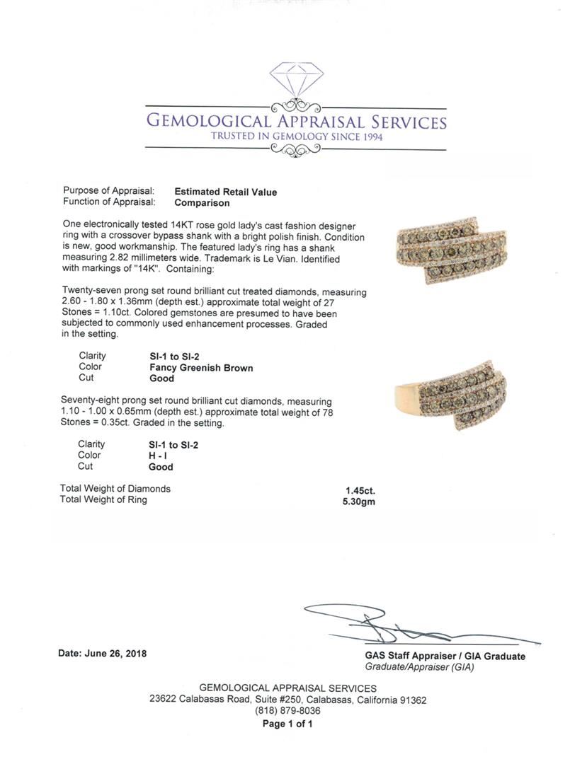 One electronically tested 14KT rose gold lady's cast fashion designer ring with a crossover bypass shank with a bright polish finish. The featured lady's ring has a shank measuring 2.82 millimeters wide. Trademark is Le Vian. Identified with markings of '14K'. Condition is new, good workmanship. Containing: Twenty-Seven prong set round brilliant cut treated diamonds, measuring 2.60 - 1.80 x 1.36mm (depth est.) approximate total weight of 27 Stones = 1.10ct. Colored gemstones are presumed to have been subjected to commonly used enhancement processes. Graded in the setting. Color Fancy Greenish Brown Clarity SI-1 to SI-2 Cut Good Seventy-Eight prong set round brilliant cut diamonds, measuring 1.10 - 1.00 x 0.65mm (depth est.) approximate total weight of 78 Stones = 0.35ct. Graded in the setting. Color H - I Clarity SI-1 to SI-2 Cut Good. Total Weight of Diamonds 1.45ct. Total Weight of Ring 5.30gm. GAS Appraised.