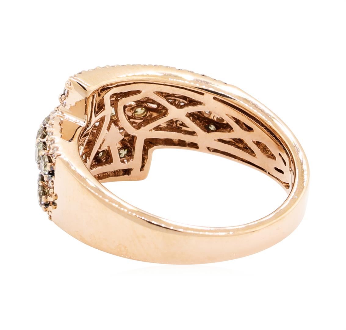 One electronically tested 14KT rose gold lady's cast fashion designer ring with a crossover bypass shank with a bright polish finish. The featured lady's ring has a shank measuring 2.82 millimeters wide. Trademark is Le Vian. Identified with markings of '14K'. Condition is new, good workmanship. Containing: Twenty-Seven prong set round brilliant cut treated diamonds, measuring 2.60 - 1.80 x 1.36mm (depth est.) approximate total weight of 27 Stones = 1.10ct. Colored gemstones are presumed to have been subjected to commonly used enhancement processes. Graded in the setting. Color Fancy Greenish Brown Clarity SI-1 to SI-2 Cut Good Seventy-Eight prong set round brilliant cut diamonds, measuring 1.10 - 1.00 x 0.65mm (depth est.) approximate total weight of 78 Stones = 0.35ct. Graded in the setting. Color H - I Clarity SI-1 to SI-2 Cut Good. Total Weight of Diamonds 1.45ct. Total Weight of Ring 5.30gm. GAS Appraised.