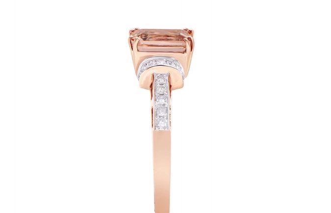 (1) Morganite stone with a total weight of 1.67cts. Gemstone Description Gemstone: Morganite Color: Peach-Pink Shape: Octagon Size: 8x6 Quantity: 1 CTW: 1.45 Diamond Description Shape: Rounds Size: 1.2-1.3mm Quantity: 24 CTW: 0.22 Grade: I1-I2 Color: H-I. Total Weight: 2.85 grams. Ring Size: 7.5.