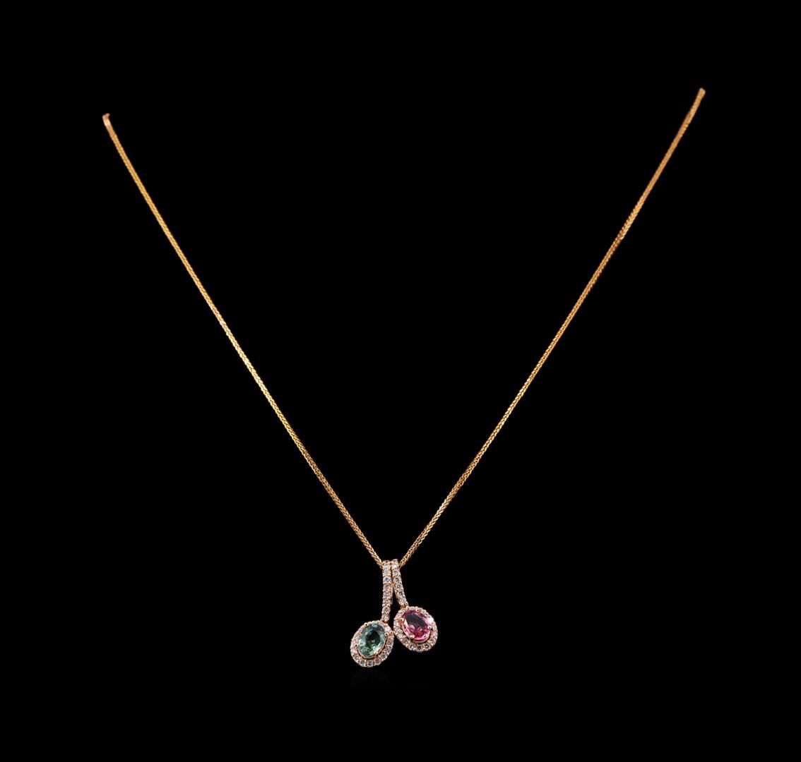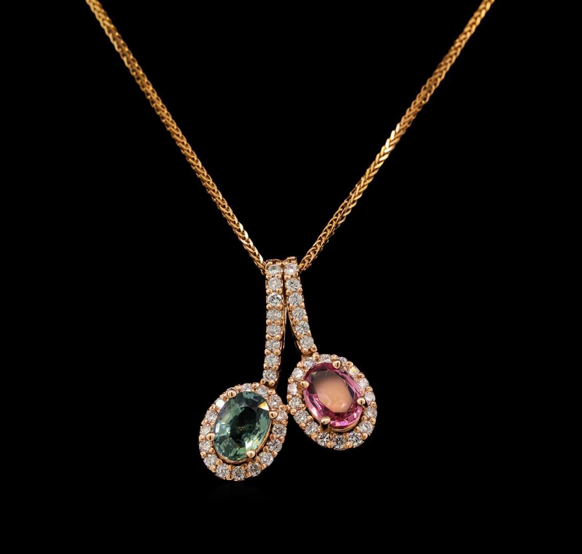 One electronically tested Gold-Rose-14KT ladies cast tourmaline and diamond pendant & chain 18.0" long, with a lobster claw clasp with a bright polish finish. Identified with markings of "14K". Condition is new. Containing: One prong set oval modified brilliant cut natural pink tourmaline, measuring 6.00. x 5.00. x 3.25mm, approximate weight of 0.83ct., clarity is eye clean, medium light, moderately strong, purple color, (GIA P 4/4), cut is good. One prong set oval modified brilliant cut natural green tourmaline, measuring 6.00. x 5.00. x 3.25mm, approximate weight of 0.63ct., clarity is slightly included, type I, medium light, very slightly grayish, bluish green color, (GIA bG 4/3), cut is good. Forty-Eight prong set round brilliant cut diamonds, measuring 1.30 - 1.30 x 0.78mm (depth est.) approximate total weight of 48 Stones = 0.38ct. Clarity: I-1 to I-2. Color: I - J, Cut is Good. Colored gemstones are presumed to have been subjected to commonly used enhancement processes. All diamonds and colored gemstones are graded in the mounting, unless otherwise stated. Total Weight of Colored Stones 1.46ct. Total Weight of Diamonds 0.38ct. Total Weight of Pendant & Chain 4.30 grams. GGL Appraised at $2,310.00.