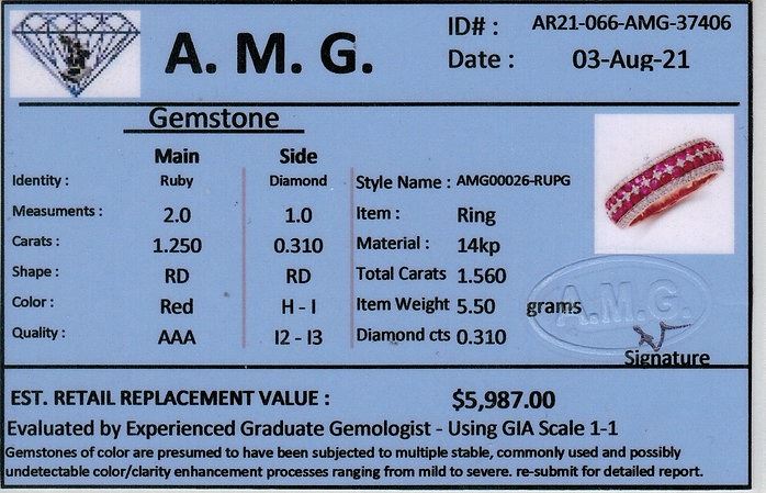 (32) Rubies with a total weight of 1.25cts. (69) Round Diamonds with a total weight of 0.31cts with a color of H-I and a clarity of I2-I3. Total weight of this ring is 5.50 grams. Ring size is 7.5.