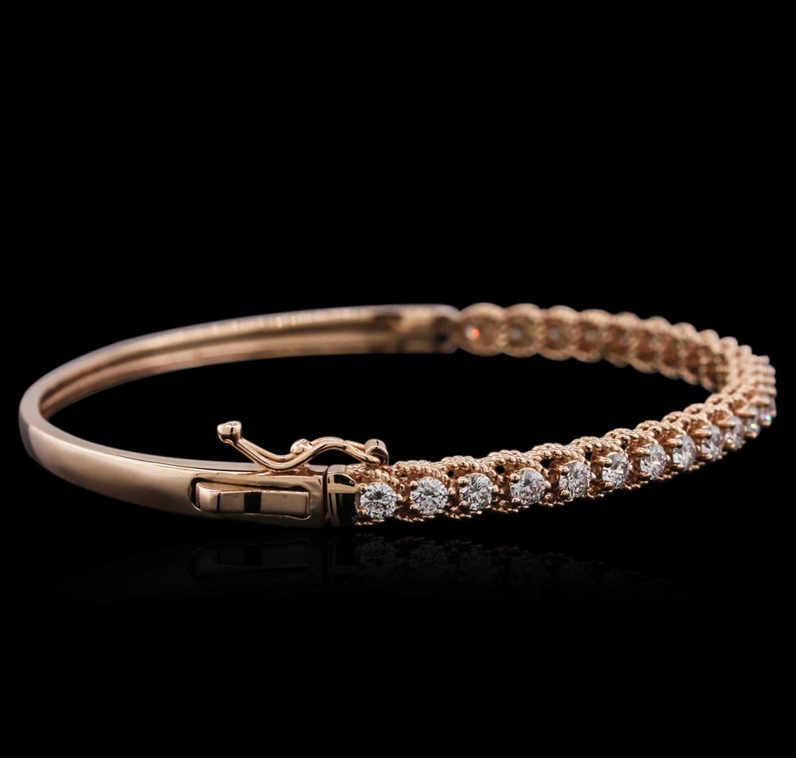 One electronically tested 14KT rose gold ladies cast diamond bangle bracelet with a hidden box clasp with safety closer with a bright polish finish. Identified with markings of "14K". Condition is new. Containing: Twenty-Five prong set round brilliant cut diamonds, measuring 2.50 - 2.50 x 1.50mm (depth est.) approximate total weight of 25 Stones = 1.59ct. Clarity: SI-1 to SI-2. Color: H - I, Cut is Good. All diamonds are graded in the mounting, unless otherwise stated. Total Weight of Diamonds 1.59ct. Total Weight of Bangle Bracelet 11.00 grams. GGL Appraised at $5,080.00.