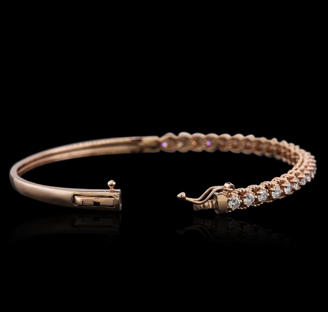 One electronically tested 14KT rose gold ladies cast diamond bangle bracelet with a hidden box clasp with safety closer with a bright polish finish. Identified with markings of "14K". Condition is new. Containing: Twenty-Five prong set round brilliant cut diamonds, measuring 2.50 - 2.50 x 1.50mm (depth est.) approximate total weight of 25 Stones = 1.59ct. Clarity: SI-1 to SI-2. Color: H - I, Cut is Good. All diamonds are graded in the mounting, unless otherwise stated. Total Weight of Diamonds 1.59ct. Total Weight of Bangle Bracelet 11.00 grams. GGL Appraised at $5,080.00.
