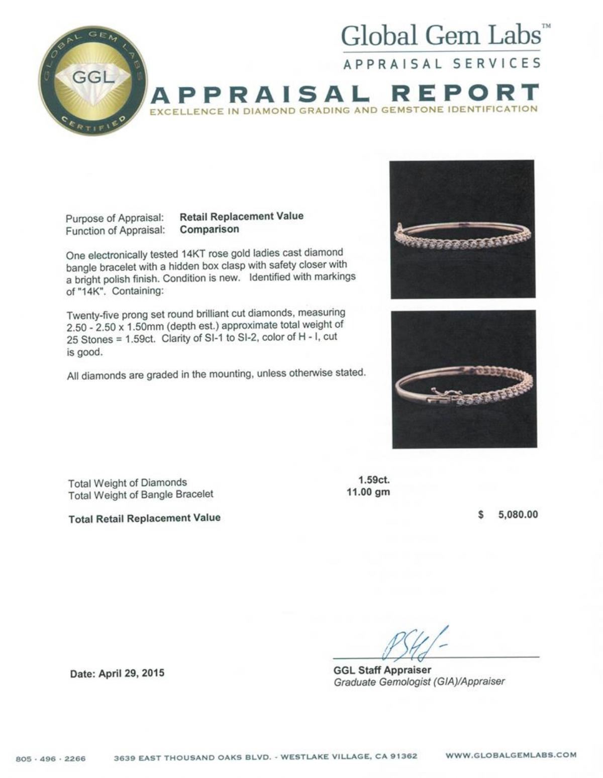 One electronically tested 14KT rose gold ladies cast diamond bangle bracelet with a hidden box clasp with safety closer with a bright polish finish. Identified with markings of "14K". Condition is new. Containing: Twenty-Five prong set round brilliant cut diamonds, measuring 2.50 - 2.50 x 1.50mm (depth est.) approximate total weight of 25 Stones = 1.59ct. Clarity: SI-1 to SI-2. Color: H - I, Cut is Good. All diamonds are graded in the mounting, unless otherwise stated. Total Weight of Diamonds 1.59ct. Total Weight of Bangle Bracelet 11.00 grams. GGL Appraised.