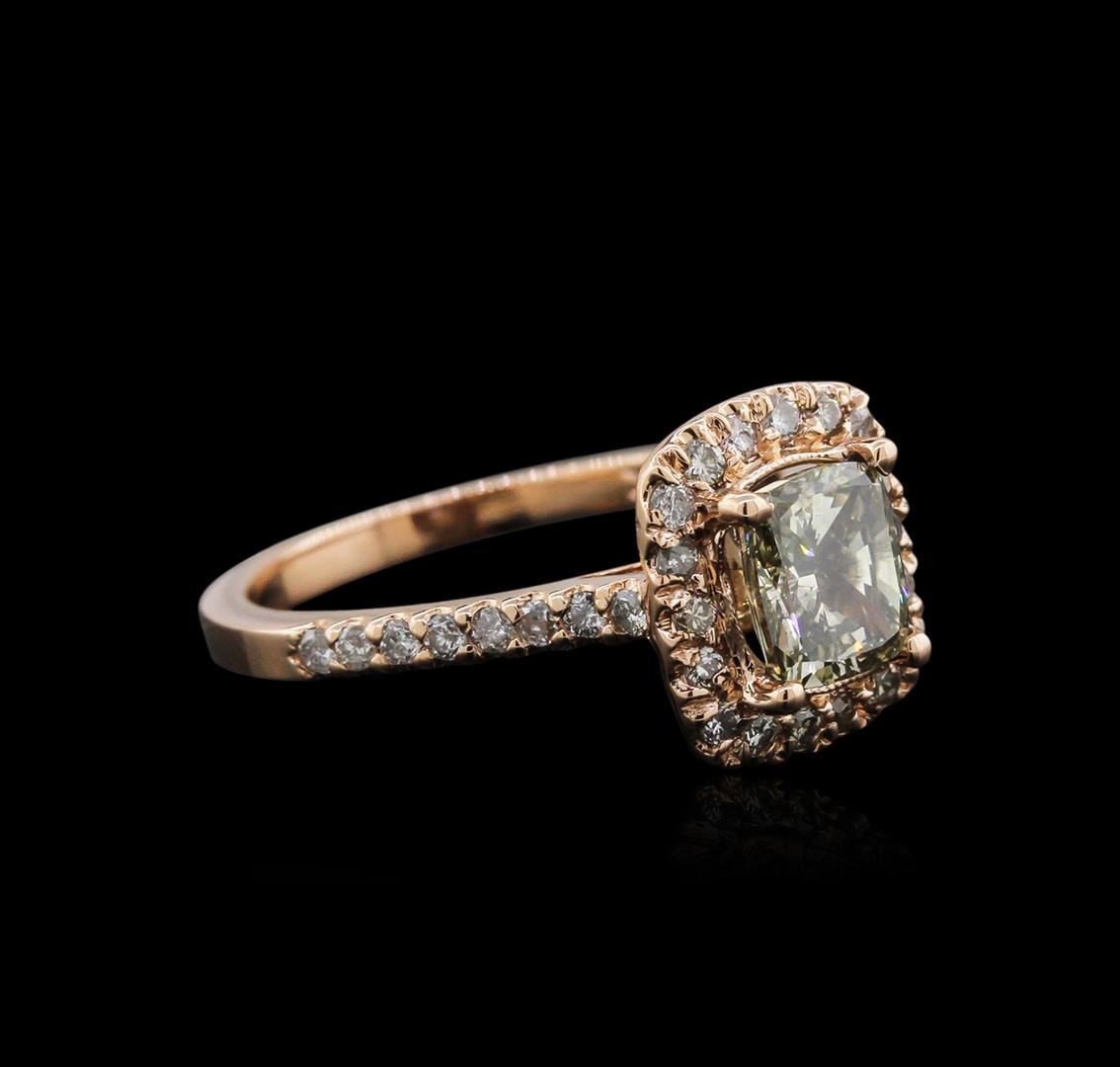 One electronically tested 14KT rose gold ladies cast diamond ring with a bright polish finish. Identified with markings of "14K". Condition is new. Containing: One prong set cushion cut diamond, measuring 6.40 x 6.40 x 3.97mm (depth est.) approximate weight of 1.38ct. Clarity: SI-2, color of Fancy Yellowish Green, Cut is Good. Whether the color of this diamond is of natural origin or an artificial process cannot currently be determined. Thirty-Five prong set round brilliant cut diamonds, measuring 1.30 - 1.30 x 0.78mm (depth est.) approximate total weight of 35 Stones = 0.28ct. Clarity: SI-2 to I-2. Color: K - L. All diamonds are graded in the mounting, unless otherwise stated. Total Weight of Diamonds 1.66ct. Total Weight of Ring 3.80 grams. GGL Appraised at $6,550.00.