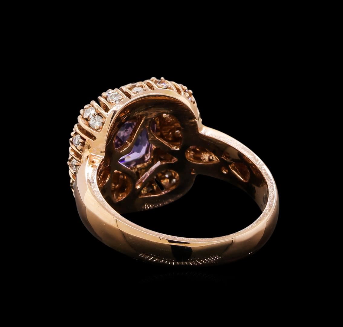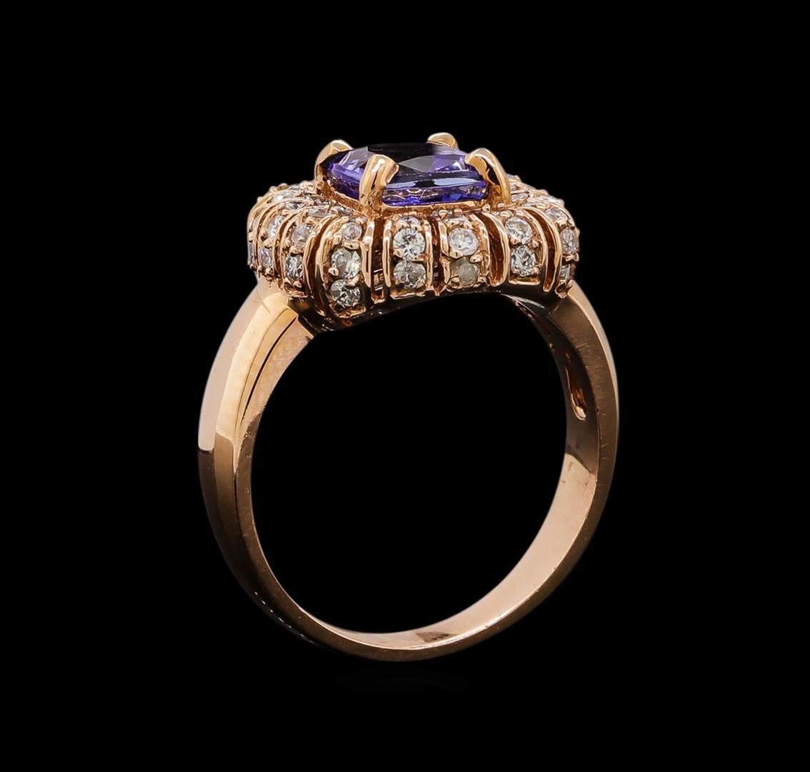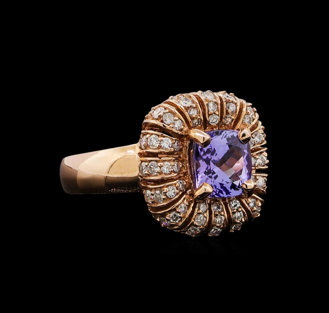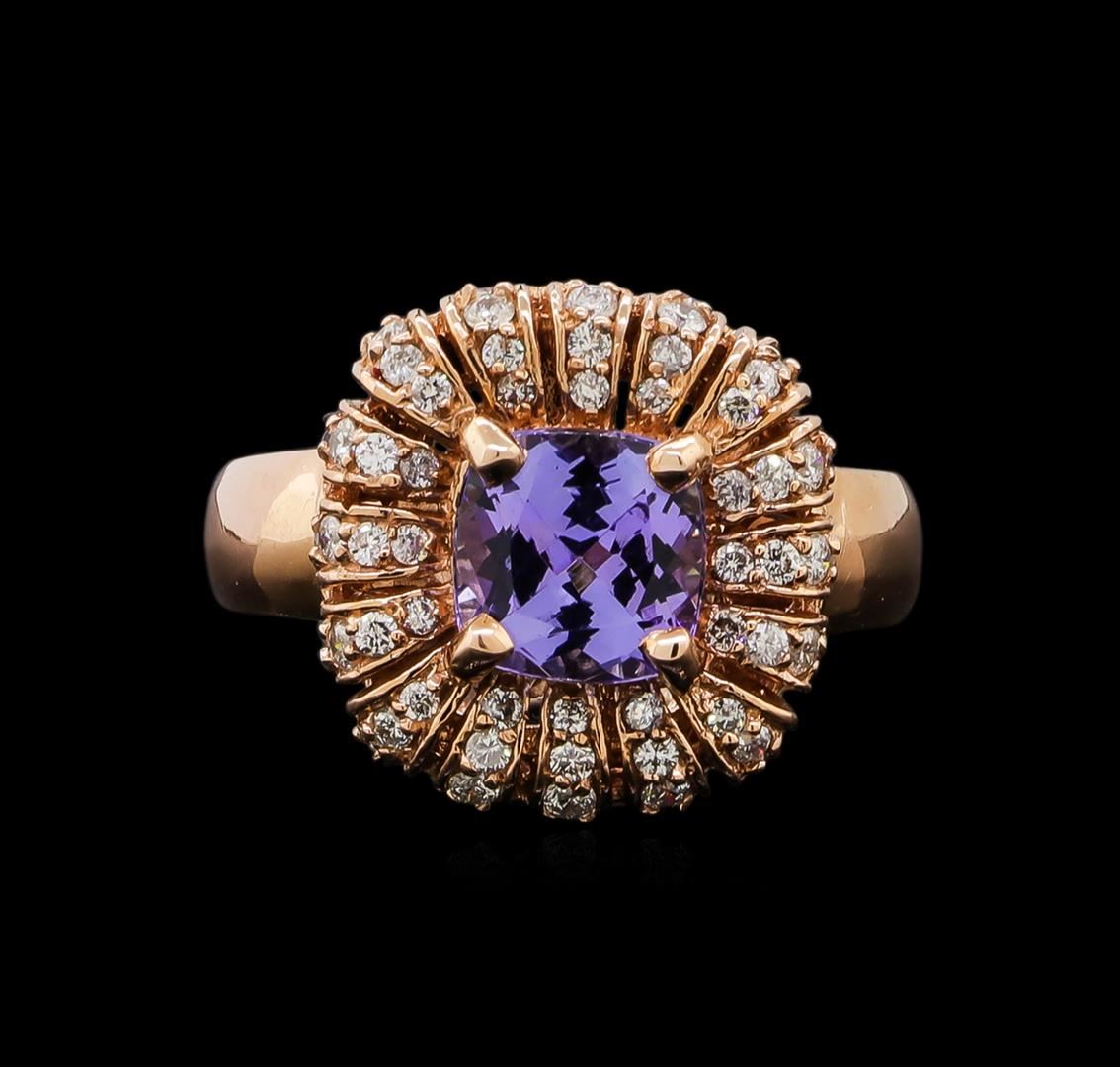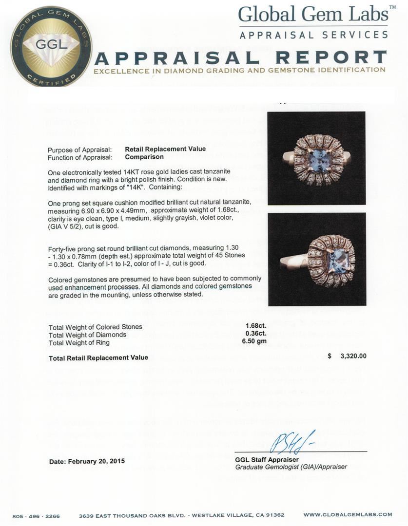 One electronically tested 14KT rose gold ladies cast tanzanite and diamond ring with a bright polish finish. Identified with markings of "14K". Condition is new. Containing: One prong set square cushion modified brilliant cut natural tanzanite, measuring 6.90 x 6.90 x 4.49mm, approximate weight of 1.68ct., clarity is eye clean, type I, medium, slightly grayish, violet color, (GIA V 5/2), cut is good. Forty-Five prong set round brilliant cut diamonds, measuring 1.30 - 1.30 x 0.78mm (depth est.) approximate total weight of 45 Stones = 0.36ct. Clarity: I-1 to I-2. Color: I - J, Cut is Good. Colored gemstones are presumed to have been subjected to commonly used enhancement processes. All diamonds and colored gemstones are graded in the mounting, unless otherwise stated. Total Weight of Colored Stones 1.68ct. Total Weight of Diamonds 0.36ct. Total Weight of Ring 6.50 grams. GGL Appraised at $3,320.00.
