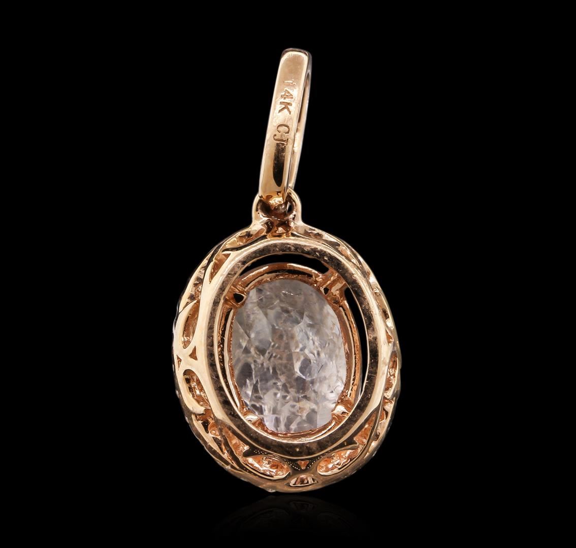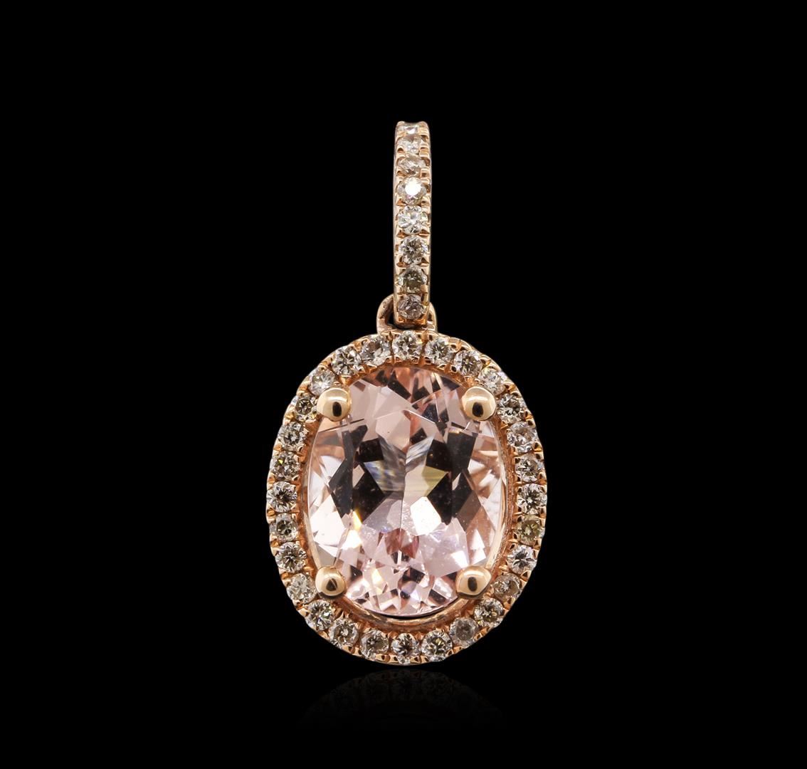 One pendant featuring: 14KT rose gold weighing 1.38 grams containing one morganite center stone with a total weight of 1.70ct and 36 round diamonds with a total weight of 0.21ct.