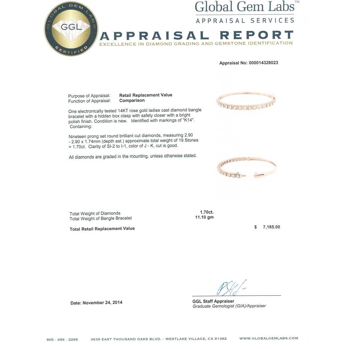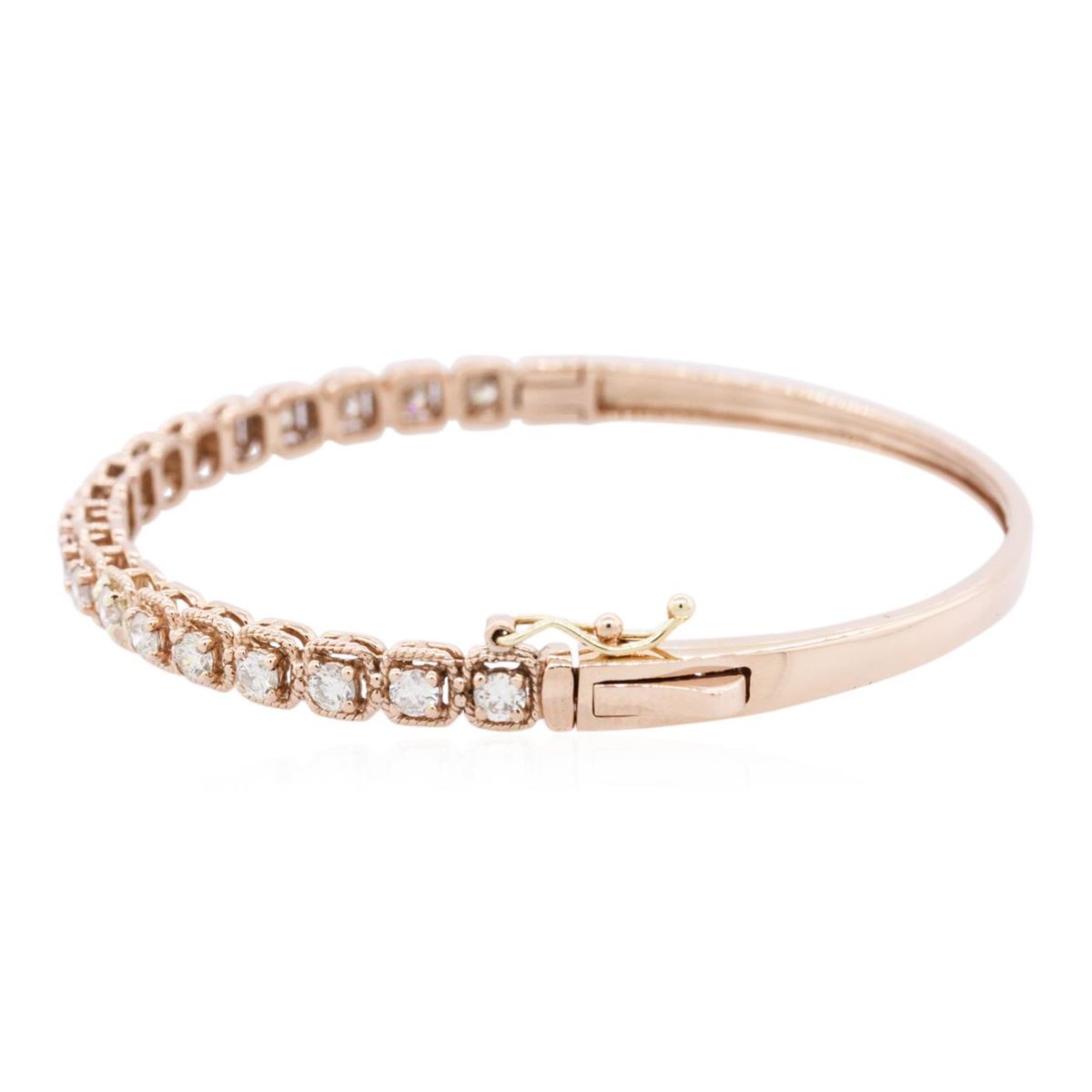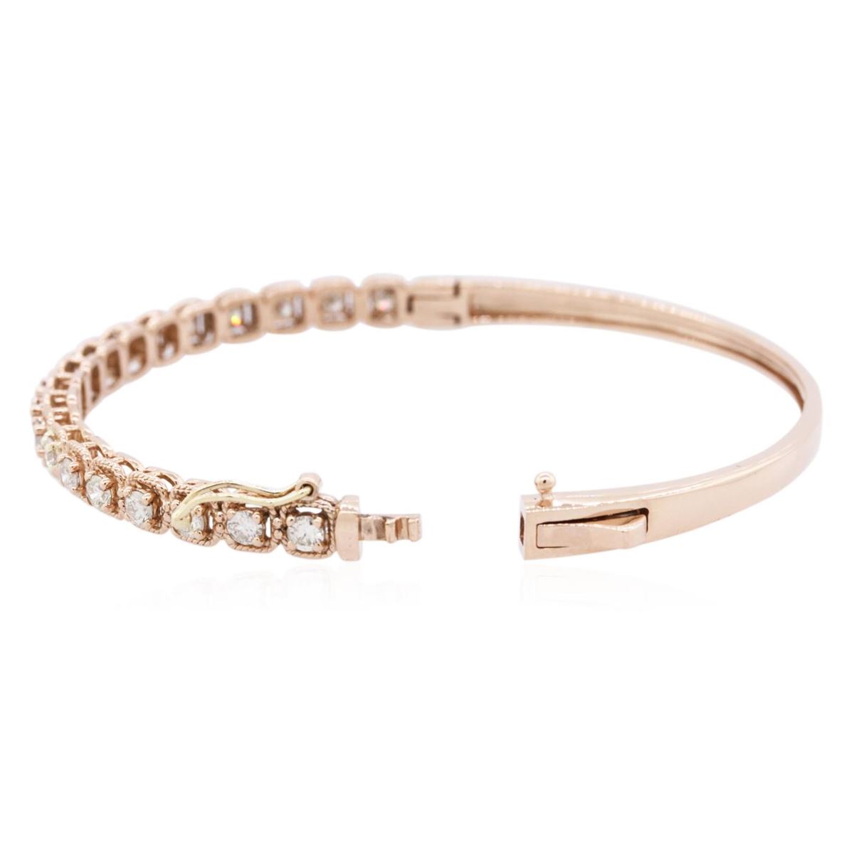 One electronically tested 14KT rose gold ladies cast diamond bangle bracelet with a hidden box clasp with safety closer with a bright polish finish. Identified with markings of "K14". Condition is new. Containing: Nineteen prong set round brilliant cut diamonds, measuring 2.90 - 2.90 x 1.74mm (depth est.) approximate total weight of 19 Stones = 1.70ct. Clarity: SI-2 to I-1. Color: J - K, Cut is Good. All diamonds are graded in the mounting, unless otherwise stated. Total Weight of Diamonds 1.70ct. Total Weight of Bangle Bracelet 11.10 grams. GGL Appraised at $7,185.00.