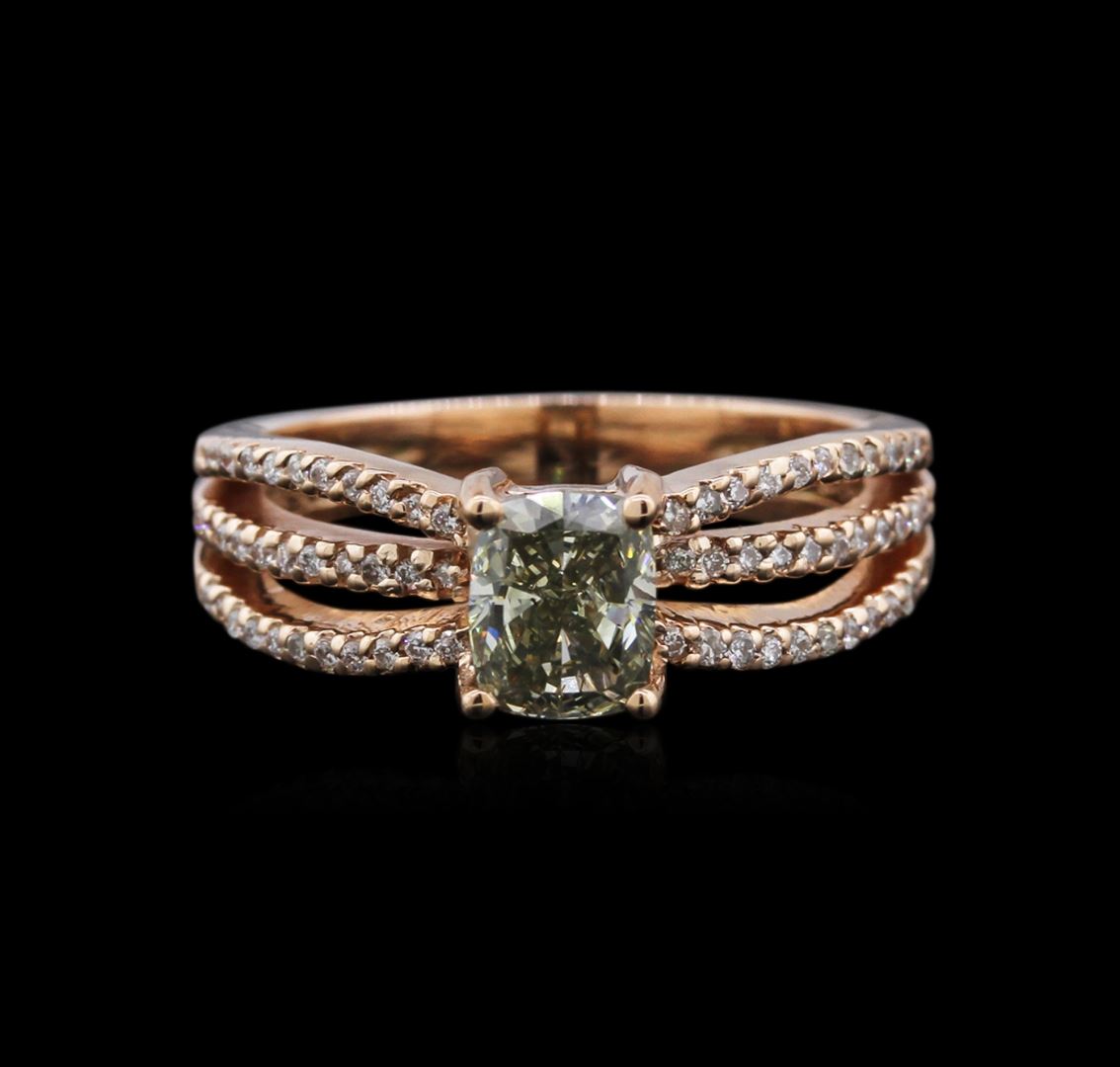 One electronically tested 14KT rose gold ladies cast diamond ring with a bright polish finish. Identified with markings of "14K". Condition is new. Containing: One prong set cushion cut diamond, measuring 6.70 x 5.50 x 4.14mm (depth est.) approximate weight of 1.30ct. Clarity: SI-1, color of Fancy Light Green, Cut is Good. Whether the color of this diamond is of natural origin or an artificial process cannot currently be determined. Sixty-Six prong set round brilliant cut diamonds, measuring 1.20 - 1.20 x 0.72mm (depth est.) approximate total weight of 66 Stones = 0.42ct. Clarity: I-1 to I-2. Color: J - K, Cut is Good. All diamonds are graded in the mounting, unless otherwise stated. Total Weight of Diamonds 1.71ct. Total Weight of Ring 6.00 grams. GGL Appraised at $5,735.00.