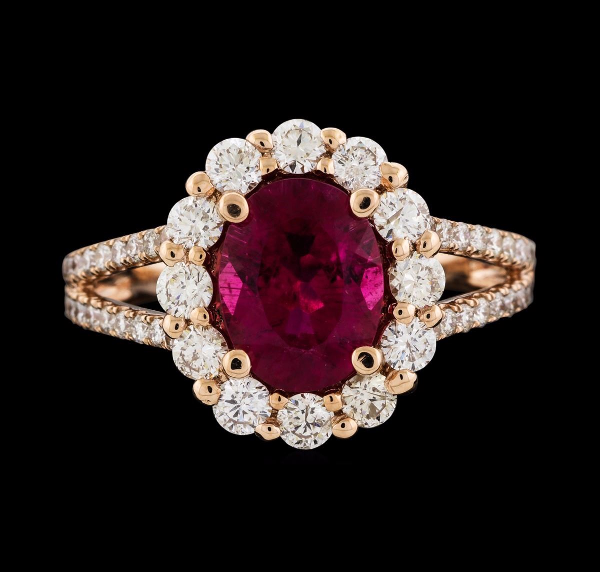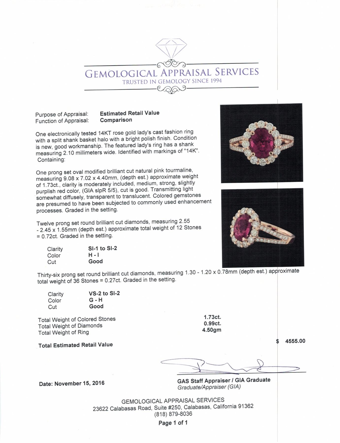 One electronically tested 14KT rose gold lady's cast fashion ring with a split shank basket halo with a bright polish finish. The featured lady's ring has a shank measuring 2.10 millimeters wide. Identified with markings of "14K". Condition is new, good workmanship. Containing: One prong set oval modified brilliant cut natural pink tourmaline, measuring 9.08 x 7.02 x 4.40mm, (depth est.) approximate weight of 1.73ct., clarity is moderately included, medium, strong, slightly purplish red color, (GIA slpR 5/5), cut is good. Transmitting light somewhat diffusely, transparent to translucent. Colored gemstones are presumed to have been subjected to commonly used enhancement processes. Graded in the setting. Twelve prong set round brilliant cut diamonds, measuring 2.55 - 2.45 x 1.55mm (depth est.) approximate total weight of 12 Stones = 0.72ct. Graded in the setting. Clarity: SI-1 to SI-2. Color: H - I Cut Good Thirty-Six prong set round brilliant cut diamonds, measuring 1.30 - 1.20 x 0.78mm (depth est.) approximate total weight of 36 Stones = 0.27ct. Graded in the setting. Clarity: VS-2 to SI-2. Color: G - HCut Good. Total Weight of Colored Stones 1.73ct. Total Weight of Diamonds 0.99ct. Total Weight of Ring 4.50gm.