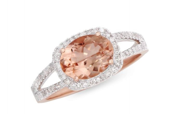 Morganite Color: Peach-Pink Shape: Oval Size: 9x7 Quantity: 1 CTW: 1.74 Diamond Description Shape: Rounds Size: 0.9 mm Quantity: 64 CTW: 0.27 Grade: I1-I2 Color: H-I. Total Weight: 2.79 grams Ring Size: 7.5 in