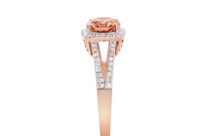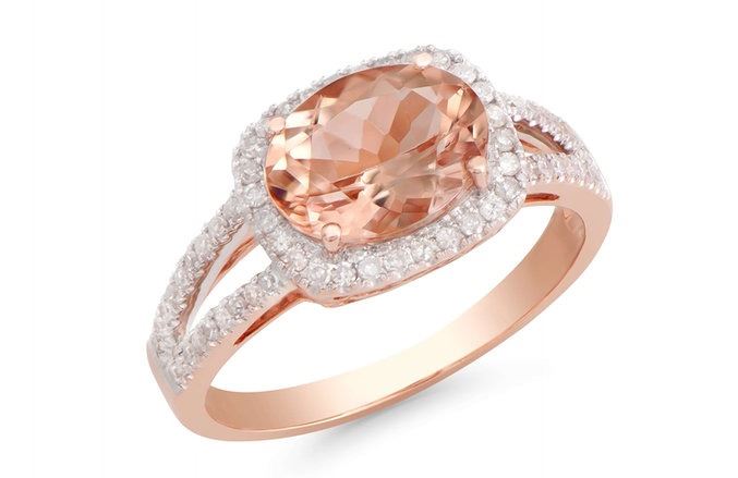 Morganite Color: Peach-Pink Shape: Oval Size: 9x7 Quantity: 1 CTW: 1.74 Diamond Description Shape: Rounds Size: 0.9 mm Quantity: 64 CTW: 0.27 Grade: I1-I2 Color: H-I. Total Weight: 2.79 grams Ring Size: 7.5 in