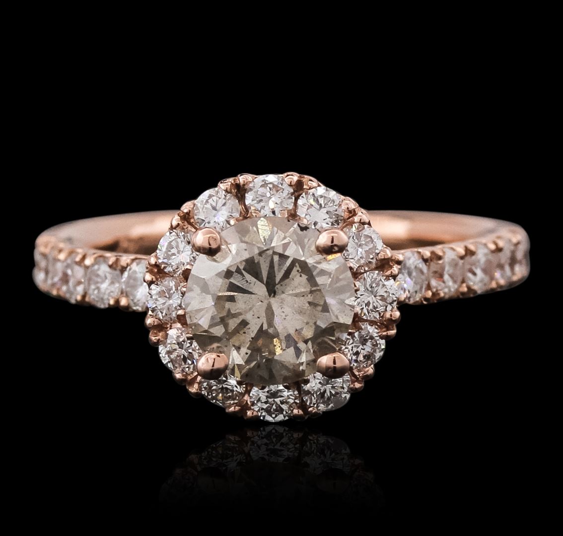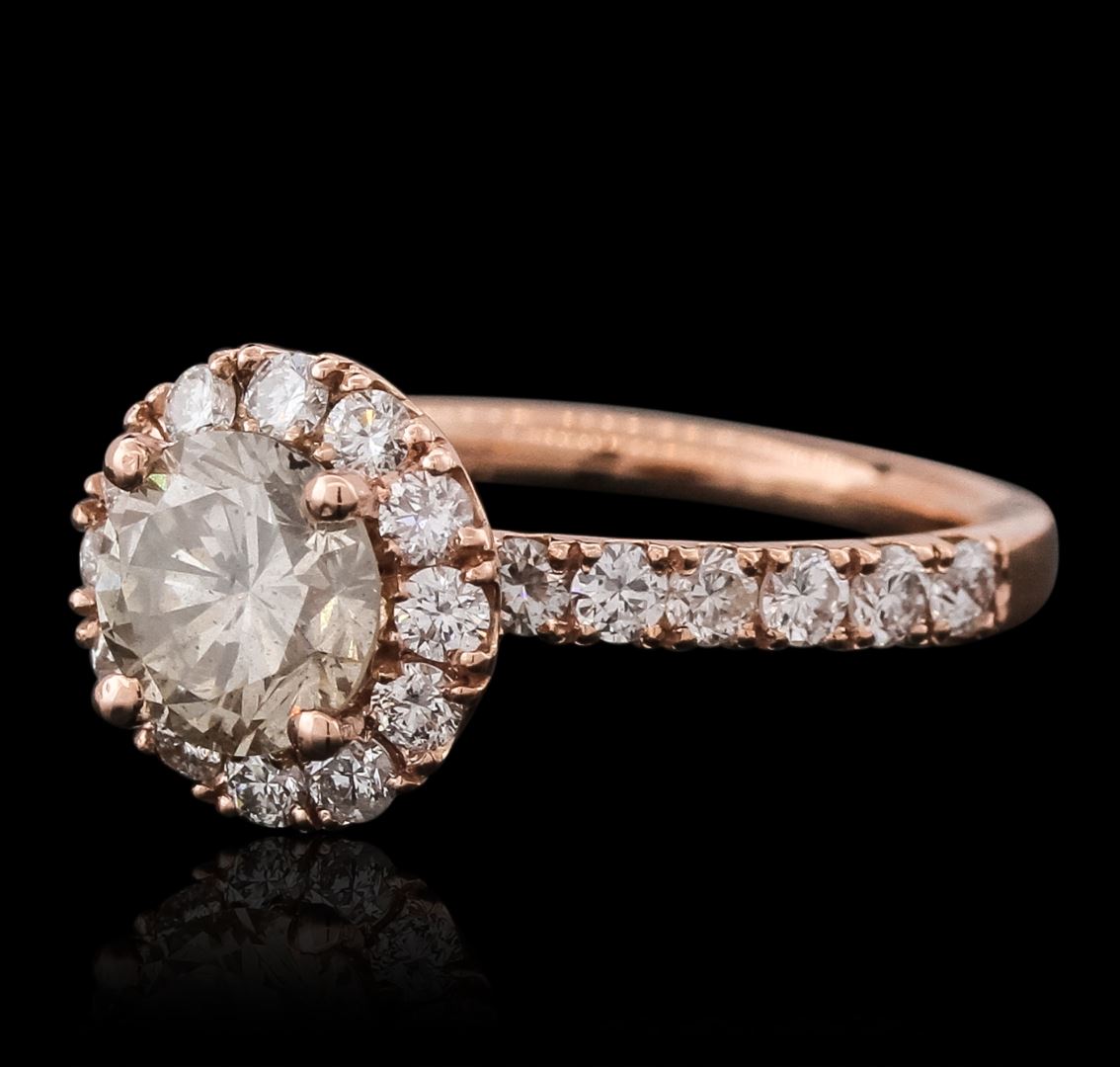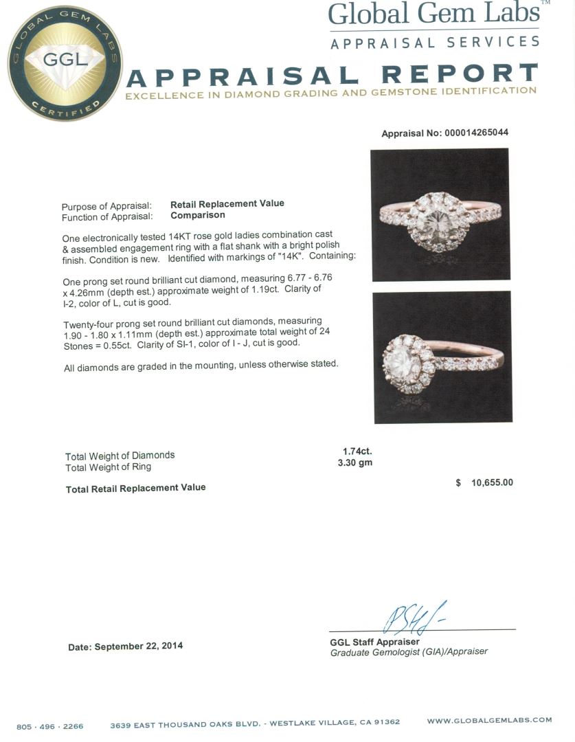 One electronically tested 14KT rose gold ladies combination cast & assembled engagement ring with a flat shank with a bright polish finish. Identified with markings of "14K". Condition is new. Containing: One prong set round brilliant cut diamond, measuring 6.77 - 6.76 x 4.26mm (depth est.) approximate weight of 1.19ct. Clarity: I-2. Color: L, Cut is Good. Twenty-Four prong set round brilliant cut diamonds, measuring 1.90 - 1.80 x 1.11mm (depth est.) approximate total weight of 24 Stones = 0.55ct. Clarity: SI-1. Color: I - J, Cut is Good. All diamonds are graded in the mounting, unless otherwise stated. Total Weight of Diamonds 1.74ct. Total Weight of Ring 3.30 grams. GGL Appraised at $10,655.00.