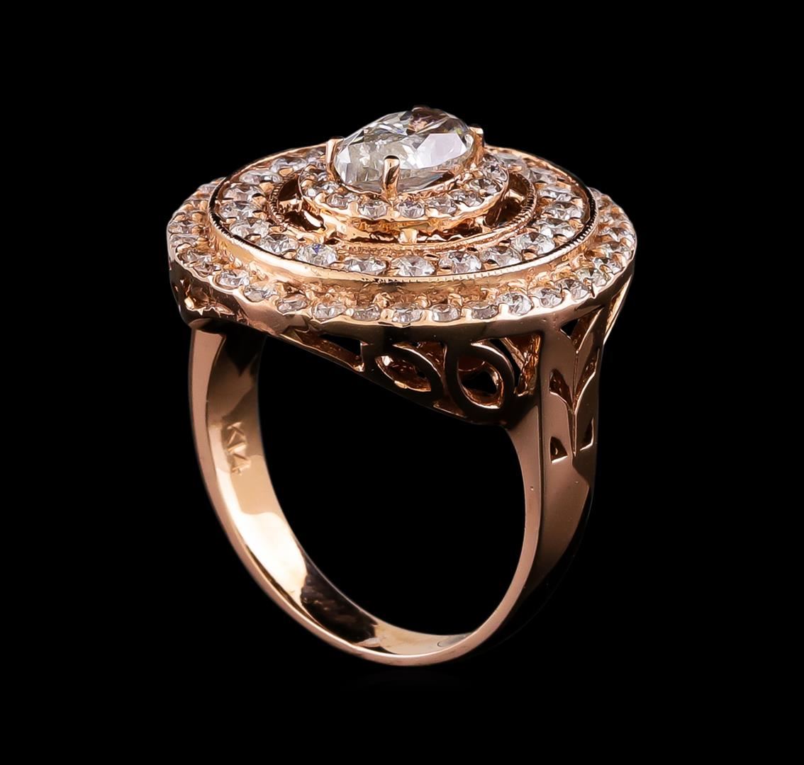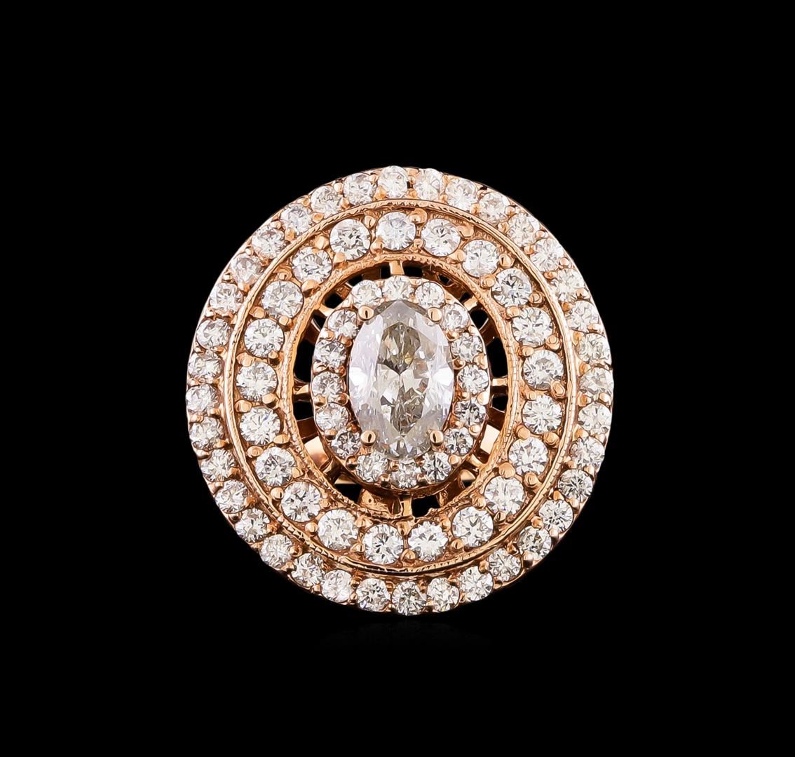One electronically tested 14KT rose gold ladies combination cast & assembled engagement ring with a flat shank with a bright polish finish. Identified with markings of "14K". Condition is new. Containing: One prong set oval shaped cut diamond, measuring 7.26 x 4.62 x 3.50mm (depth est.) approximate weight of 0.77ct. Clarity: I-1. Color: K, Cut is Good. Seventy-Three prong set round brilliant cut diamonds, measuring 1.80 - 1.30 x 0.93mm (depth est.) approximate total weight of 73 Stones = 0.99ct. Clarity: SI-2 to I-2. Color: J - K, Cut is Good. All diamonds are graded in the mounting, unless otherwise stated. Total Weight of Diamonds 1.76ct. Total Weight of Ring 6.50 grams. GGL Appraised at $7,080.00.