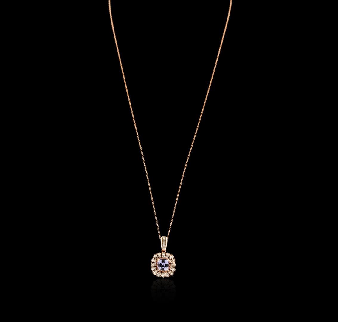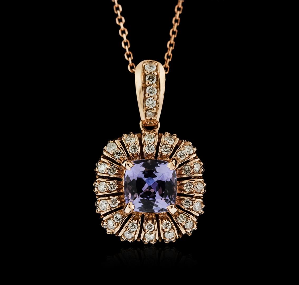 One electronically tested 14KT rose gold ladies cast tanzanite and diamond pendant & chain 18.0" long, with a spring ring clasp with a bright polish finish. Identified with markings of "14K". Condition is new. Containing: One prong set oval square cushion modified brilliant cut natural tanzanite, measuring 7.00 x 7.00 x 4.55mm, approximate weight of 1.76ct., clarity is eye clean, type I, medium light, very slightly grayish, violet color, (GIA V 4/3), cut is good. Thirty-Seven prong set round brilliant cut diamonds, measuring 1.30 - 1.30 x 0.78mm (depth est.) approximate total weight of 37 Stones = 0.30ct. Clarity: SI-2 to I-1. Color: I - J, Cut is Good. Colored gemstones are presumed to have been subjected to commonly used enhancement processes. All diamonds and colored gemstones are graded in the mounting, unless otherwise stated. Total Weight of Colored Stones 1.76ct. Total Weight of Diamonds 0.30ct. Total Weight of Pendant & Chain 5.50 grams. GGL Appraised at $3,050.00.