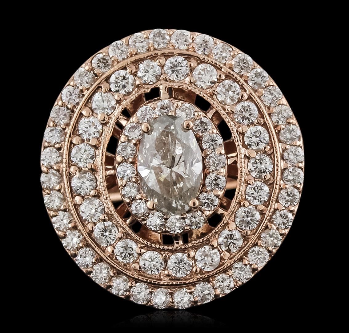 One electronically tested 14KT rose gold ladies combination cast & assembled engagement ring with a flat shank with a bright polish finish. Identified with markings of "14K". Condition is new. Containing: One prong set oval shaped cut diamond, measuring 7.26 x 4.62 x 3.50mm (depth est.) approximate weight of 0.77ct. Clarity: I-1. Color: K, Cut is Good. Seventy-Three prong set round brilliant cut diamonds, measuring 1.80 - 1.30 x 0.93mm (depth est.) approximate total weight of 73 Stones = 0.99ct. Clarity: SI-2 to I-2. Color: J - K, Cut is Good. All diamonds are graded in the mounting, unless otherwise stated. Total Weight of Diamonds 1.76ct. Total Weight of Ring 6.50 grams. GGL Appraised at $7,080.00.