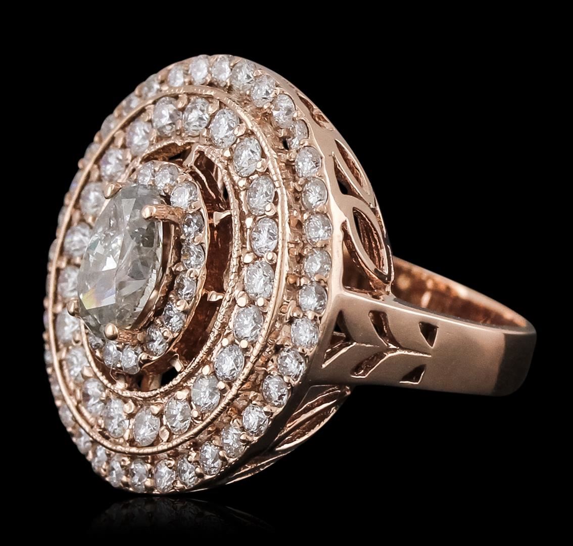 One electronically tested 14KT rose gold ladies combination cast & assembled engagement ring with a flat shank with a bright polish finish. Identified with markings of "14K". Condition is new. Containing: One prong set oval shaped cut diamond, measuring 7.26 x 4.62 x 3.50mm (depth est.) approximate weight of 0.77ct. Clarity: I-1. Color: K, Cut is Good. Seventy-Three prong set round brilliant cut diamonds, measuring 1.80 - 1.30 x 0.93mm (depth est.) approximate total weight of 73 Stones = 0.99ct. Clarity: SI-2 to I-2. Color: J - K, Cut is Good. All diamonds are graded in the mounting, unless otherwise stated. Total Weight of Diamonds 1.76ct. Total Weight of Ring 6.50 grams. GGL Appraised at $7,080.00.