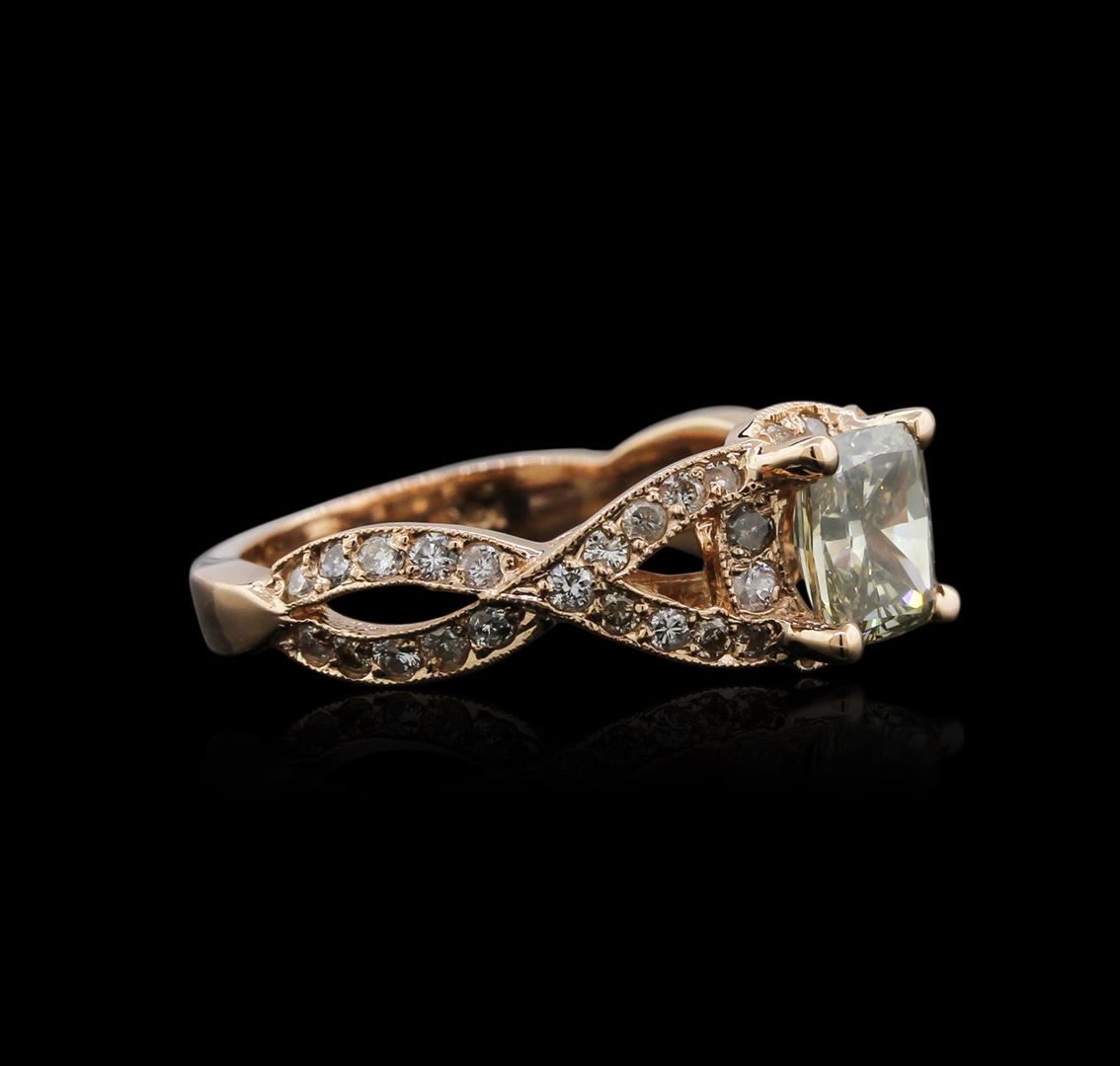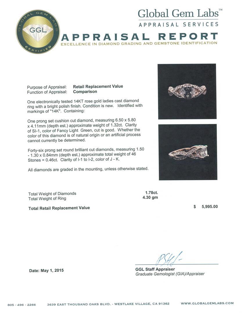 One electronically tested 14KT rose gold ladies cast diamond ring with a bright polish finish. Identified with markings of "14K". Condition is new. Containing: One prong set cushion cut diamond, measuring 6.50 x 5.80 x 4.11mm (depth est.) approximate weight of 1.32ct. Clarity: SI-1, color of Fancy Light Green, Cut is Good. Whether the color of this diamond is of natural origin or an artificial process cannot currently be determined. Forty-Six prong set round brilliant cut diamonds, measuring 1.50 - 1.30 x 0.84mm (depth est.) approximate total weight of 46 Stones = 0.46ct. Clarity: I-1 to I-2. Color: J - K. All diamonds are graded in the mounting, unless otherwise stated. Total Weight of Diamonds 1.78ct. Total Weight of Ring 4.30 grams. GGL Appraised at $5,995.00.
